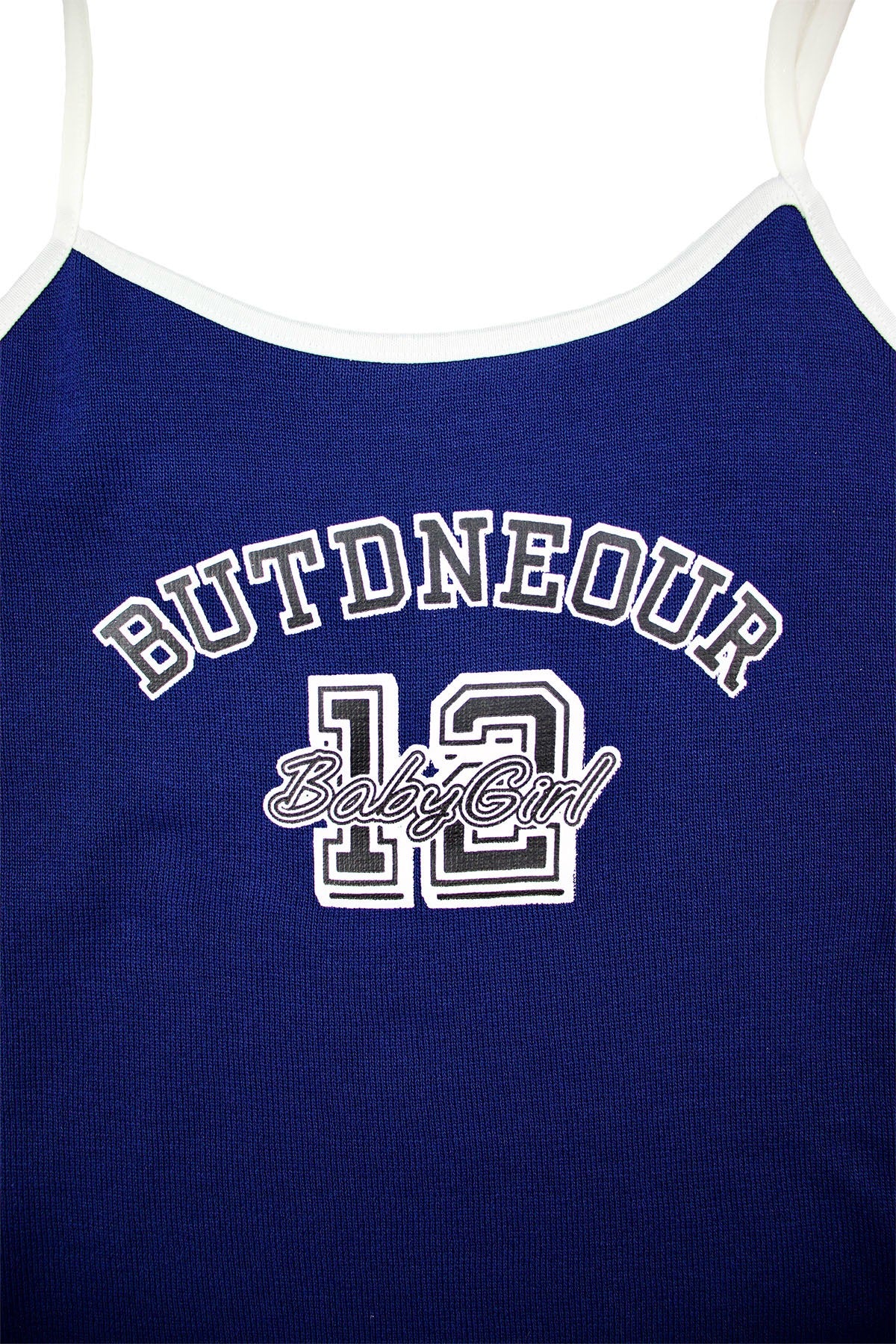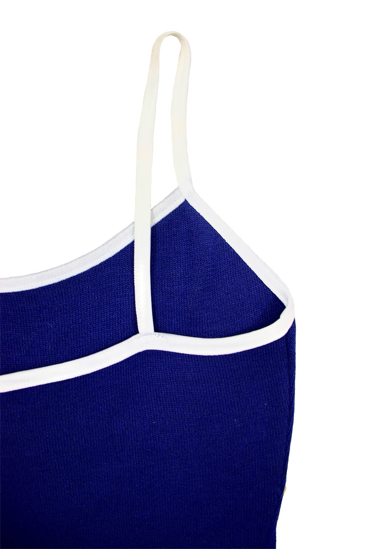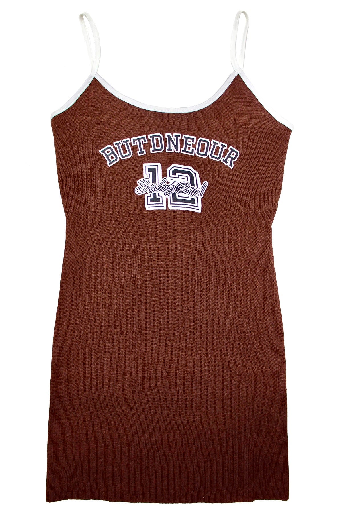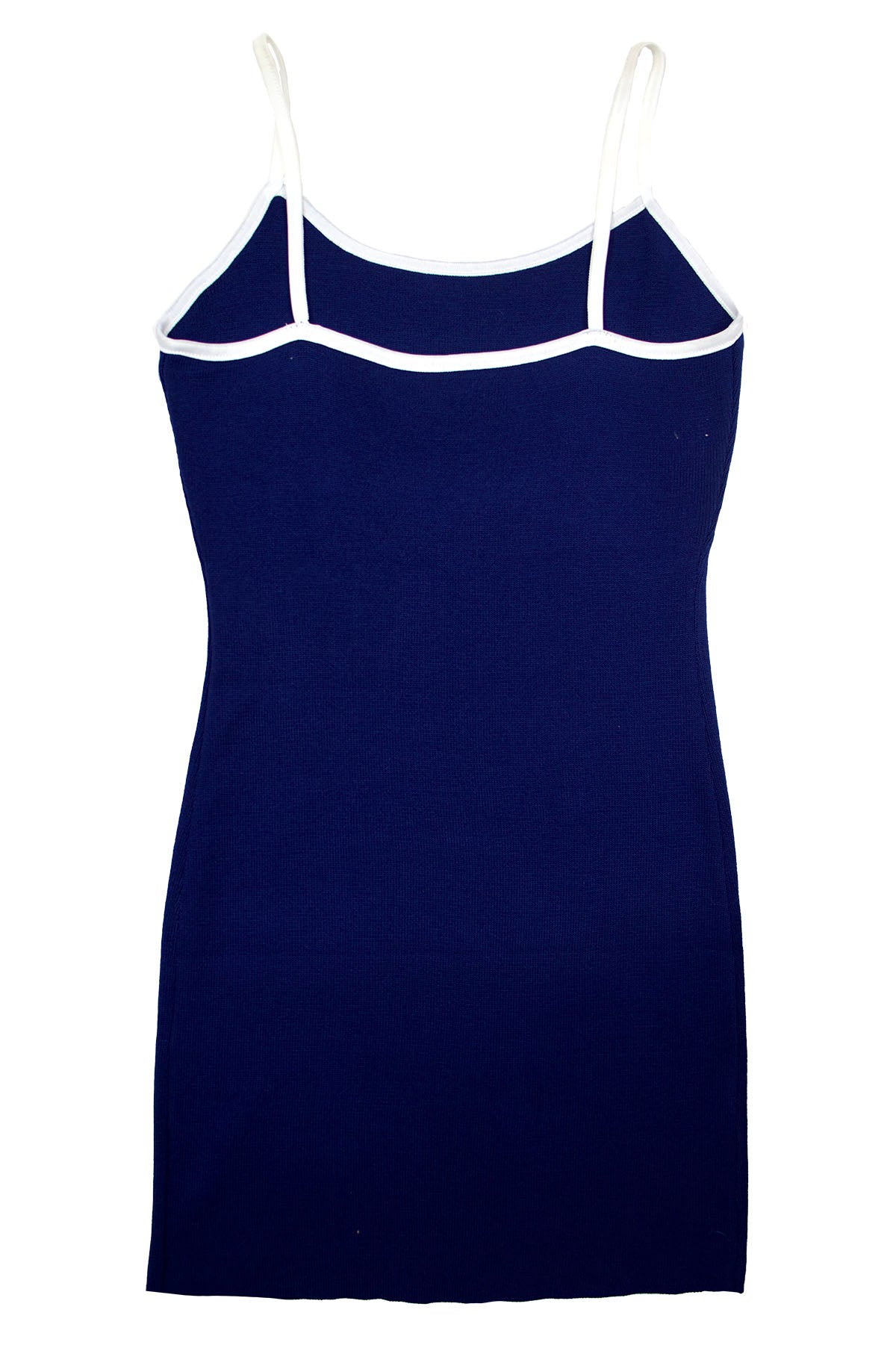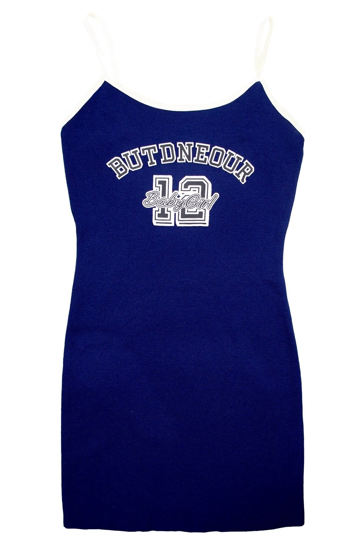 Bodycon knit mini dress with spaghetti straps. Bold front text graphic design with white trim along the neckline and straps.