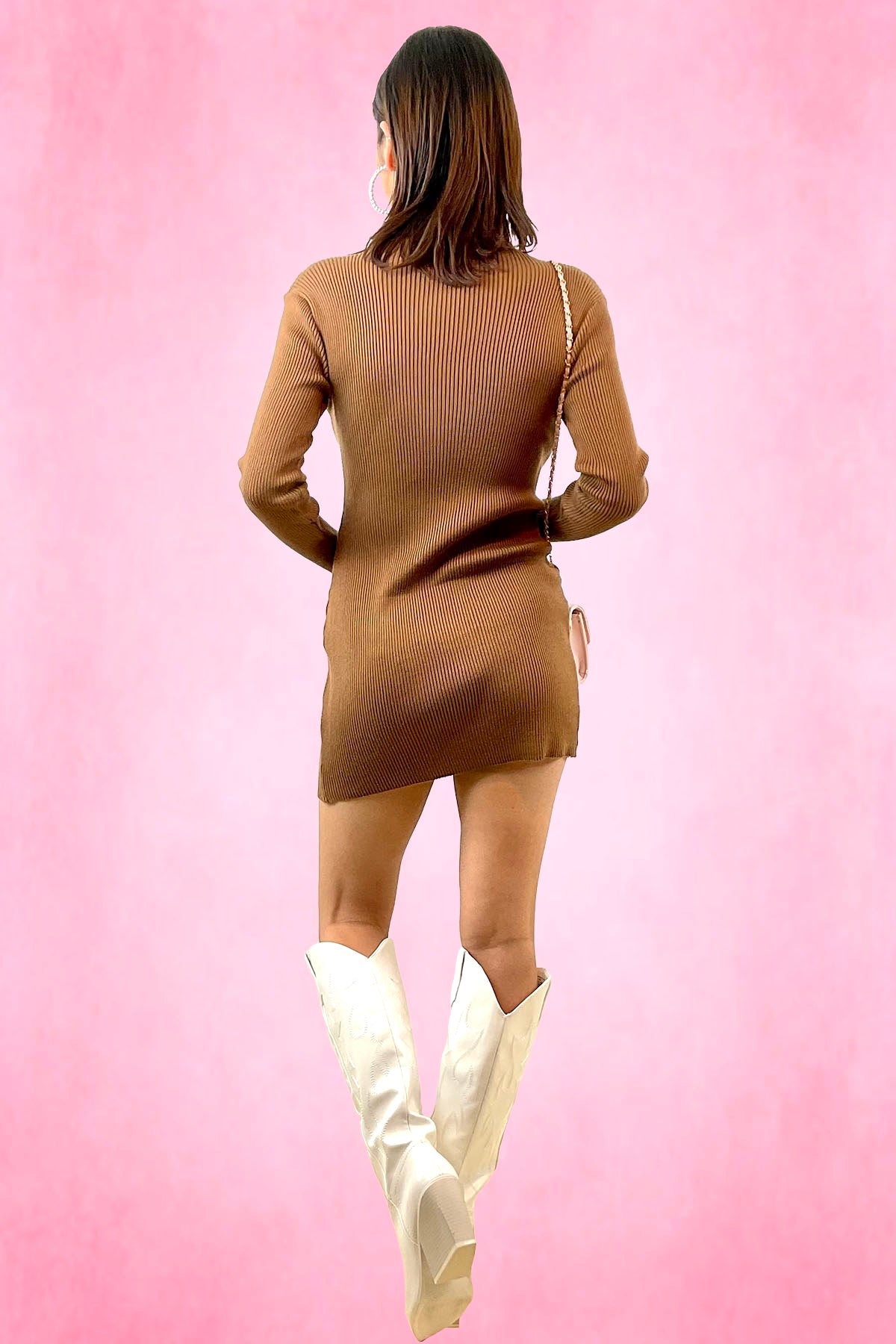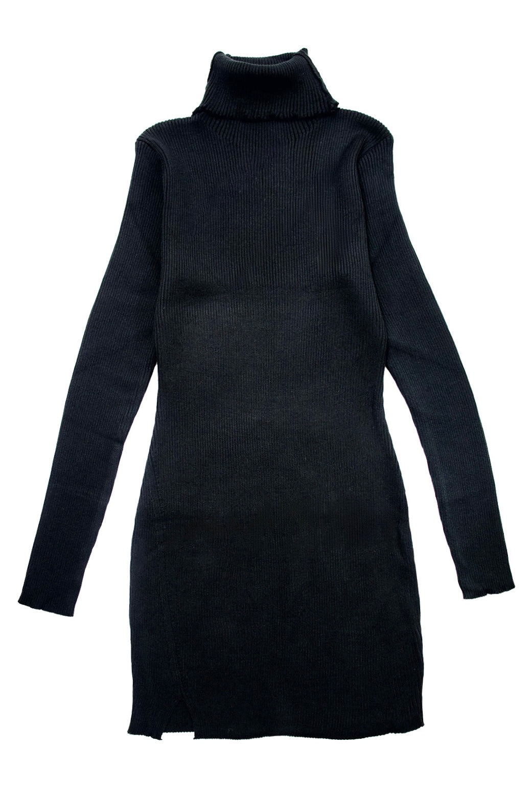 Turtle neck rib knit mini dress with long sleeve. Little slit on the right side of the hem. Made with soft rib knit stretch fabric.
