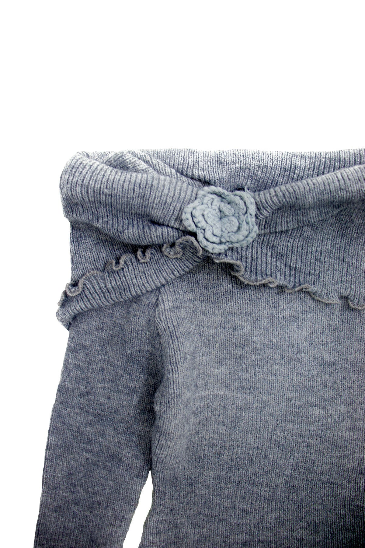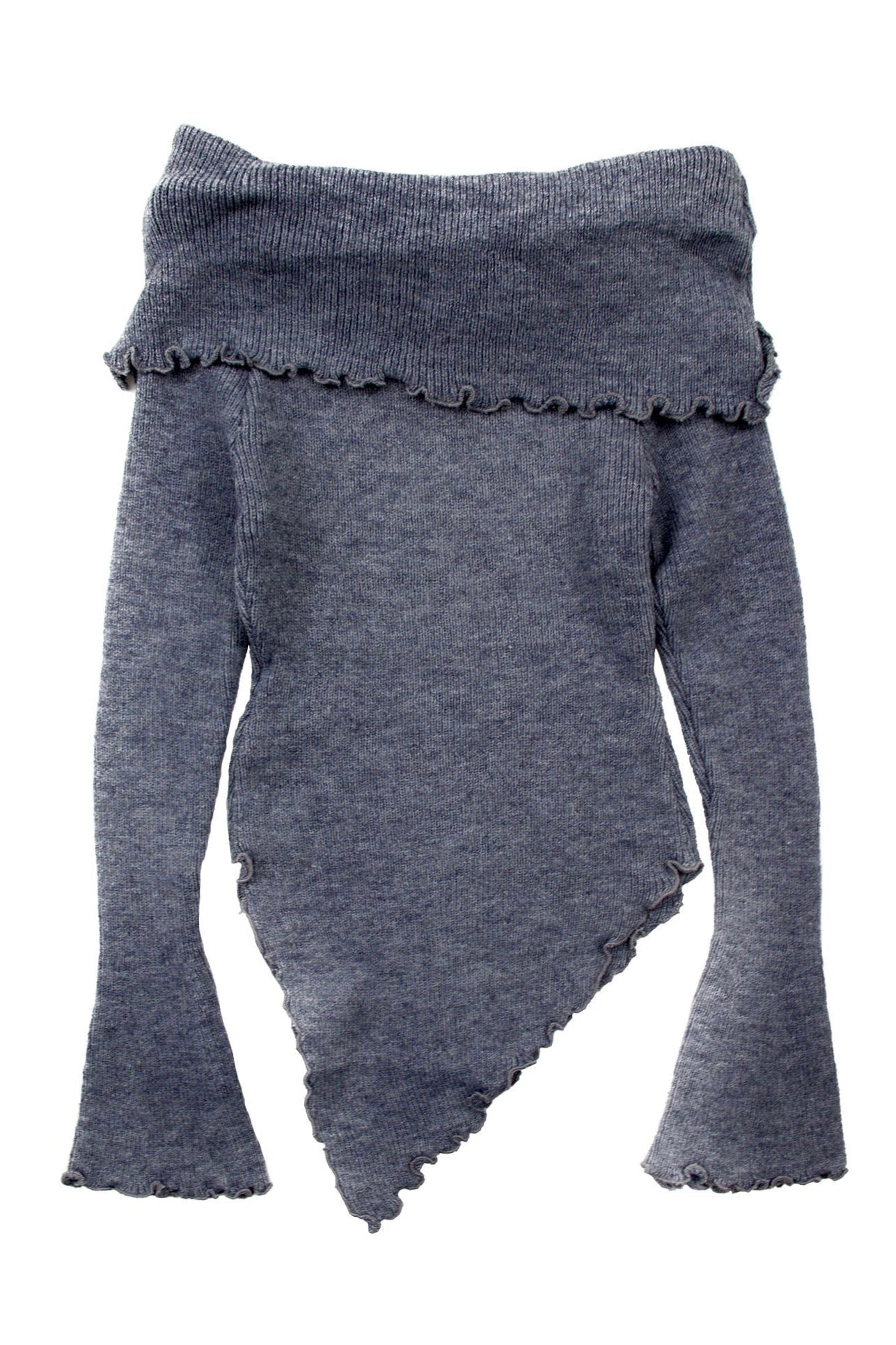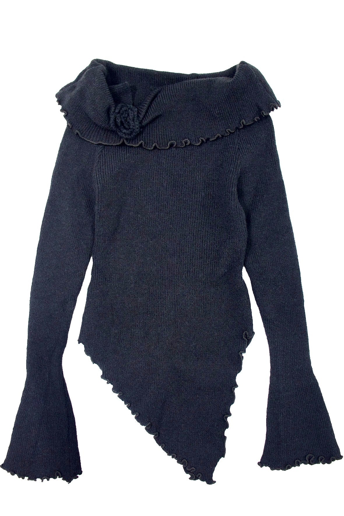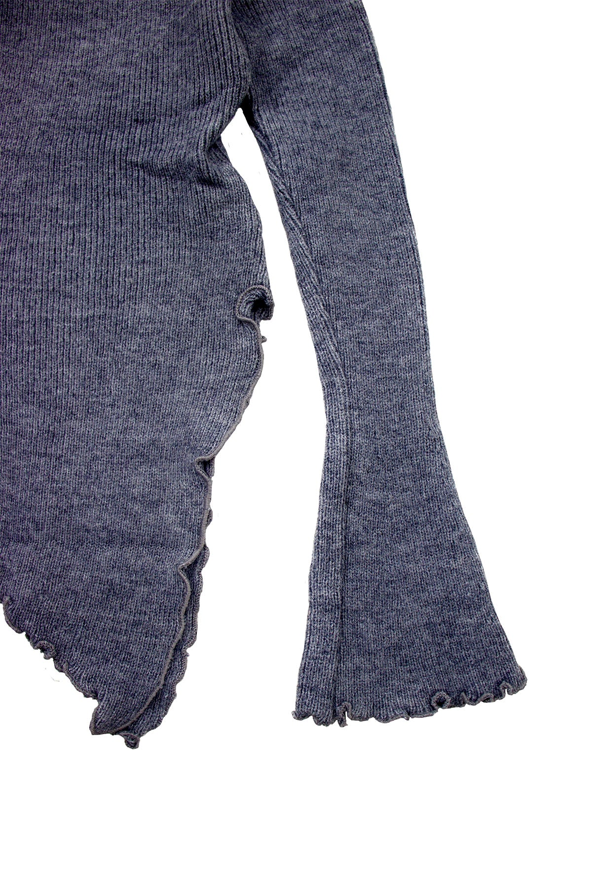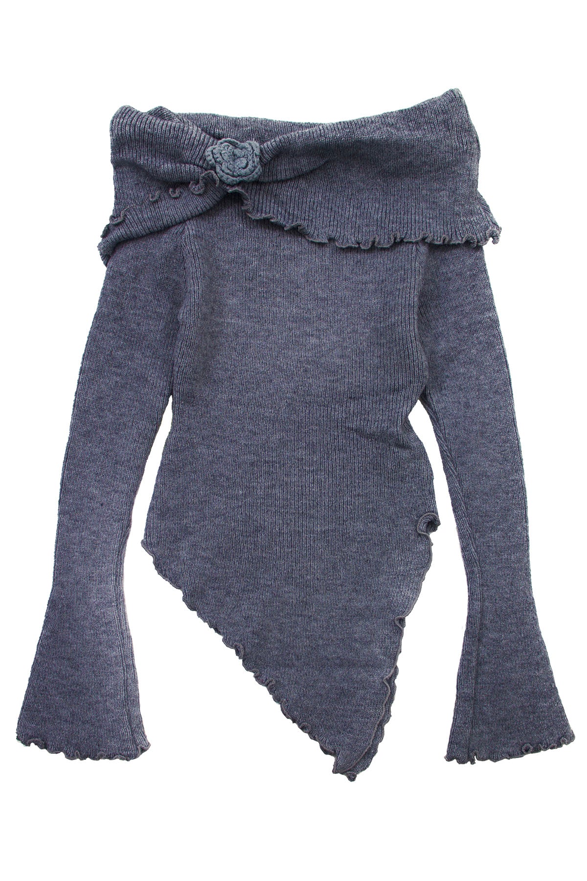 Long sleeve ribbed knit with asymmetrical design with lettuce hem. Flower motif on the right side top.