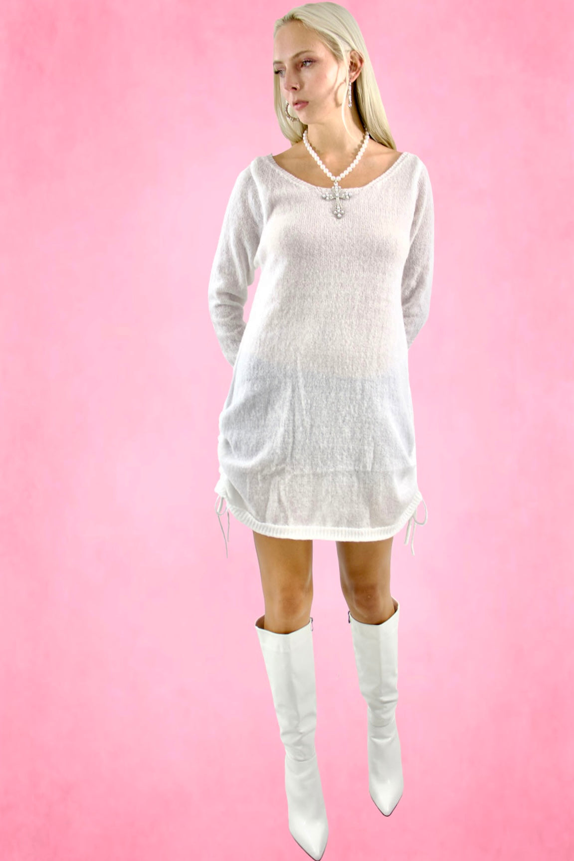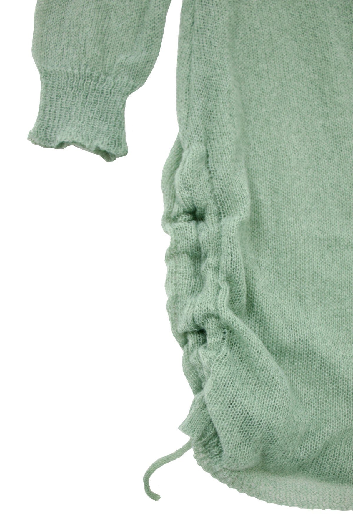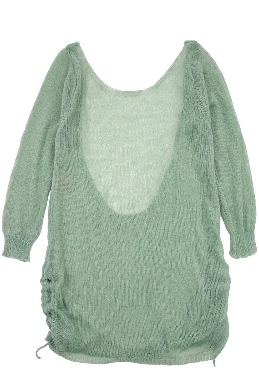 Soft mohair knit long sleeve dress with wide open back. Adjustable ribbon on the both side of the hem.
