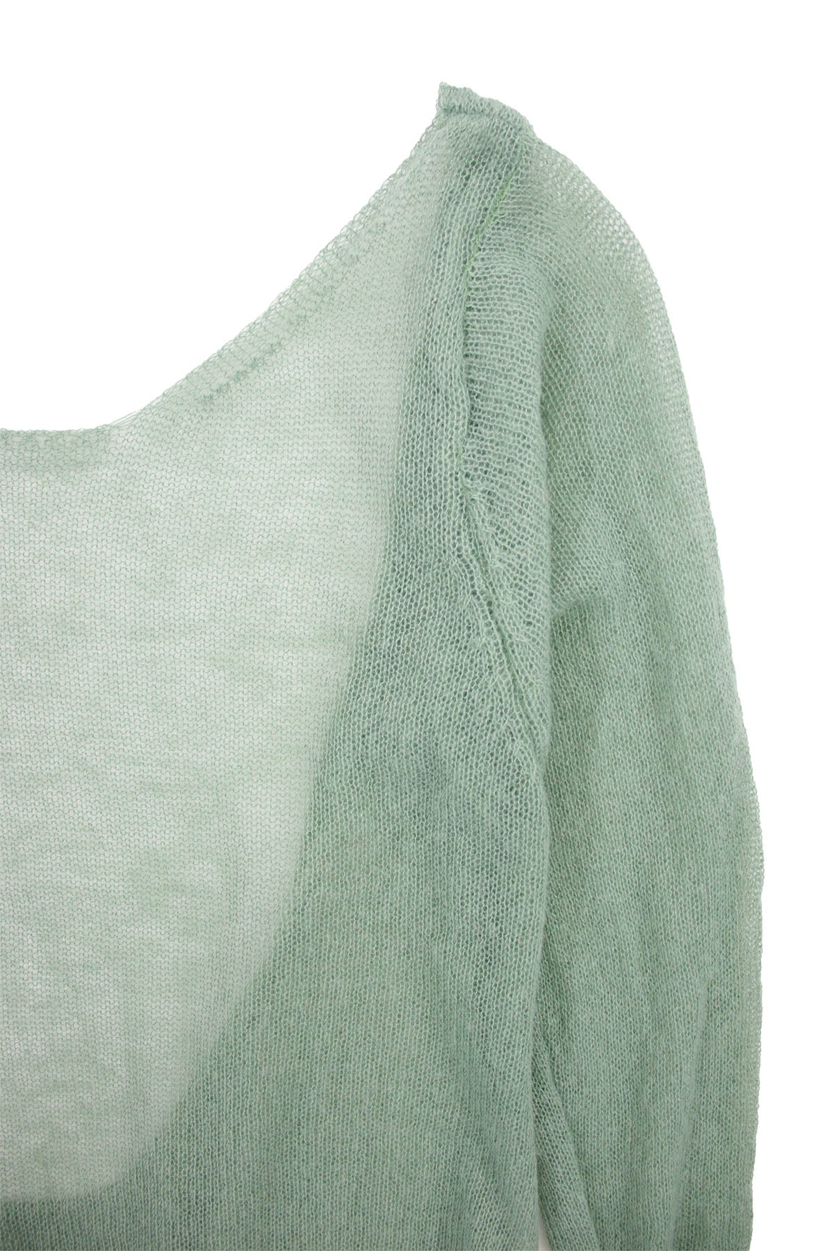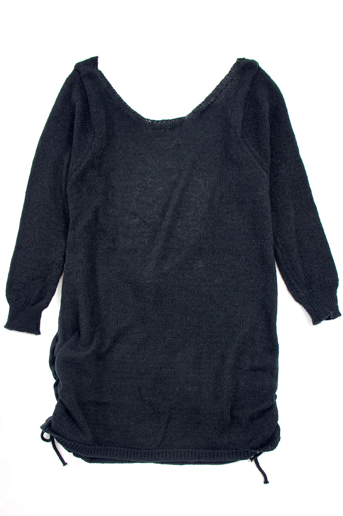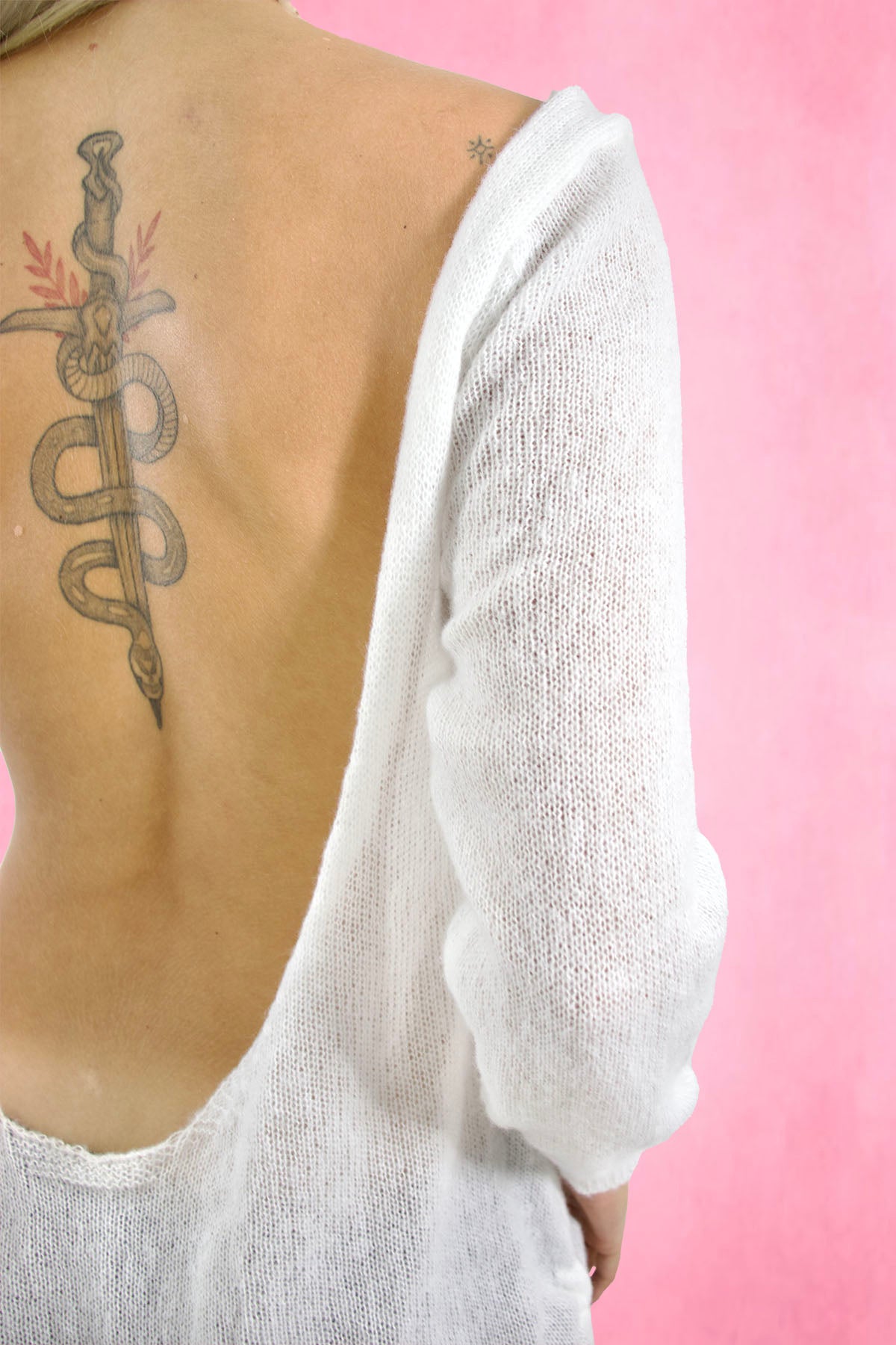 Soft mohair knit long sleeve dress with wide open back. Adjustable ribbon on the both side of the hem.