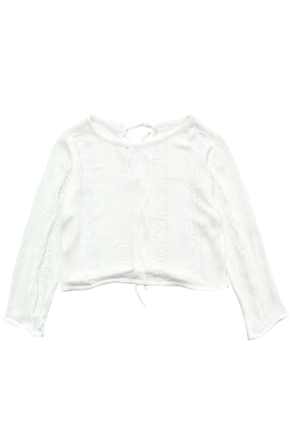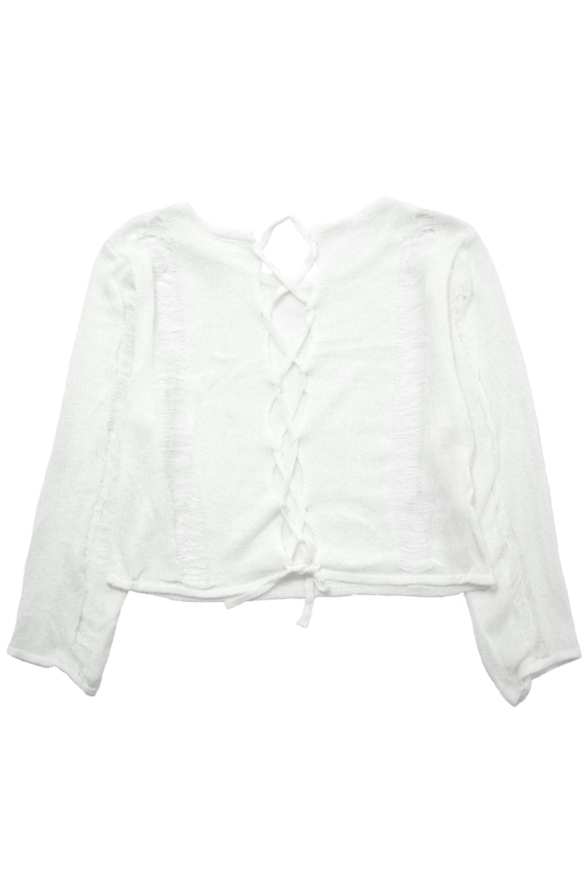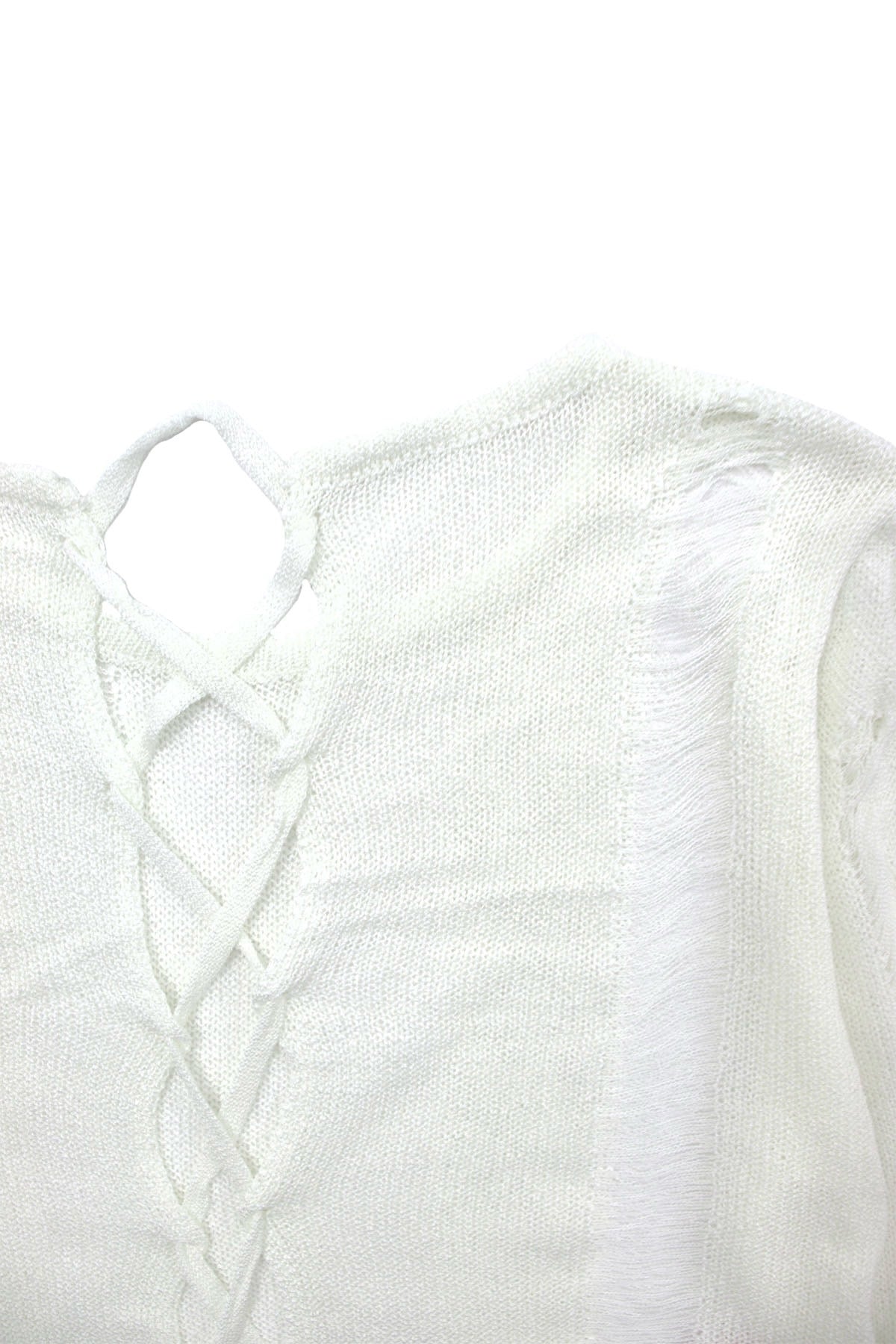 Distressed knit top with open weave long sleeve. Round neckline, lace up back design.