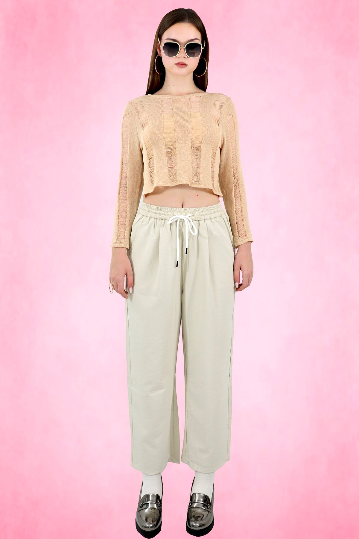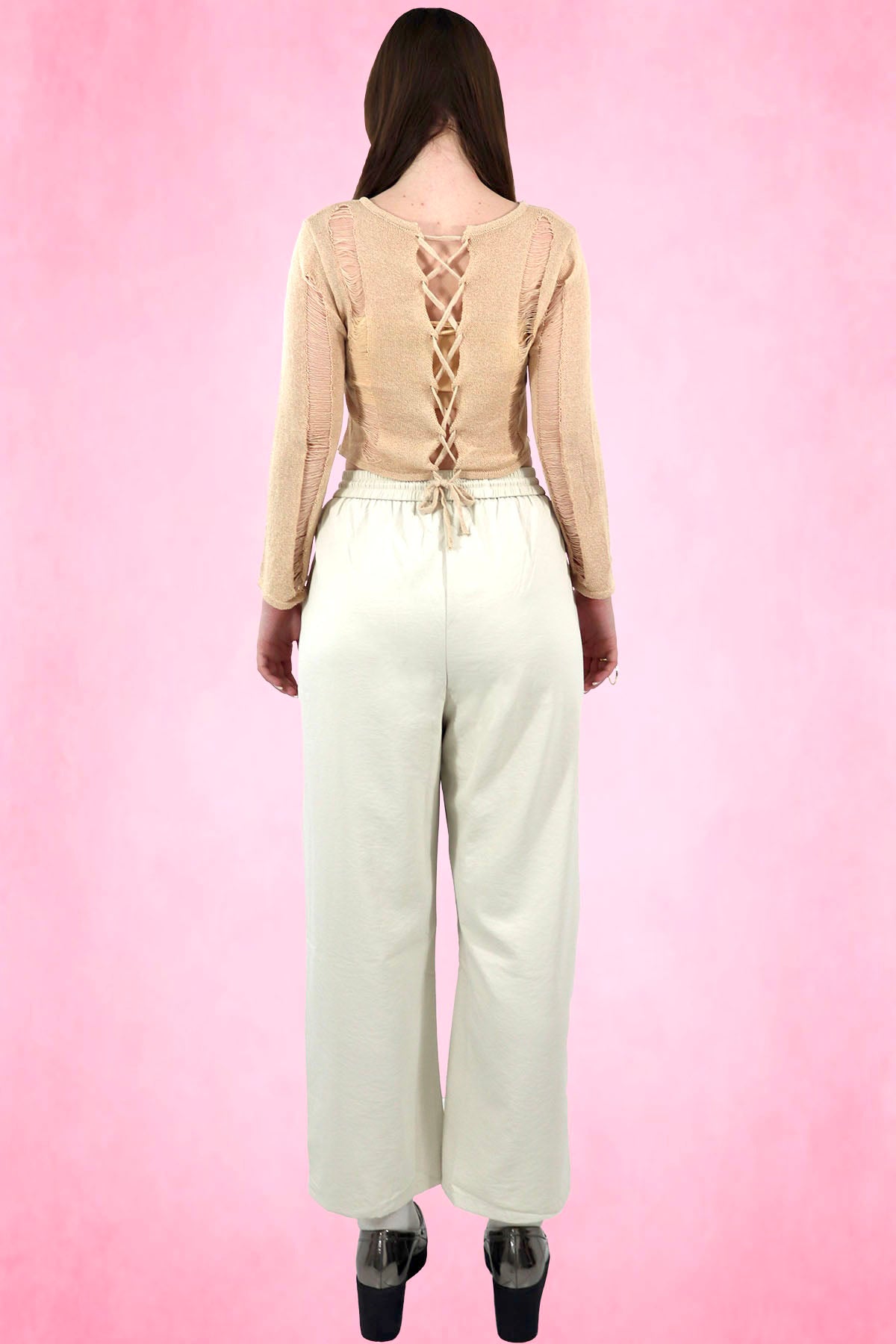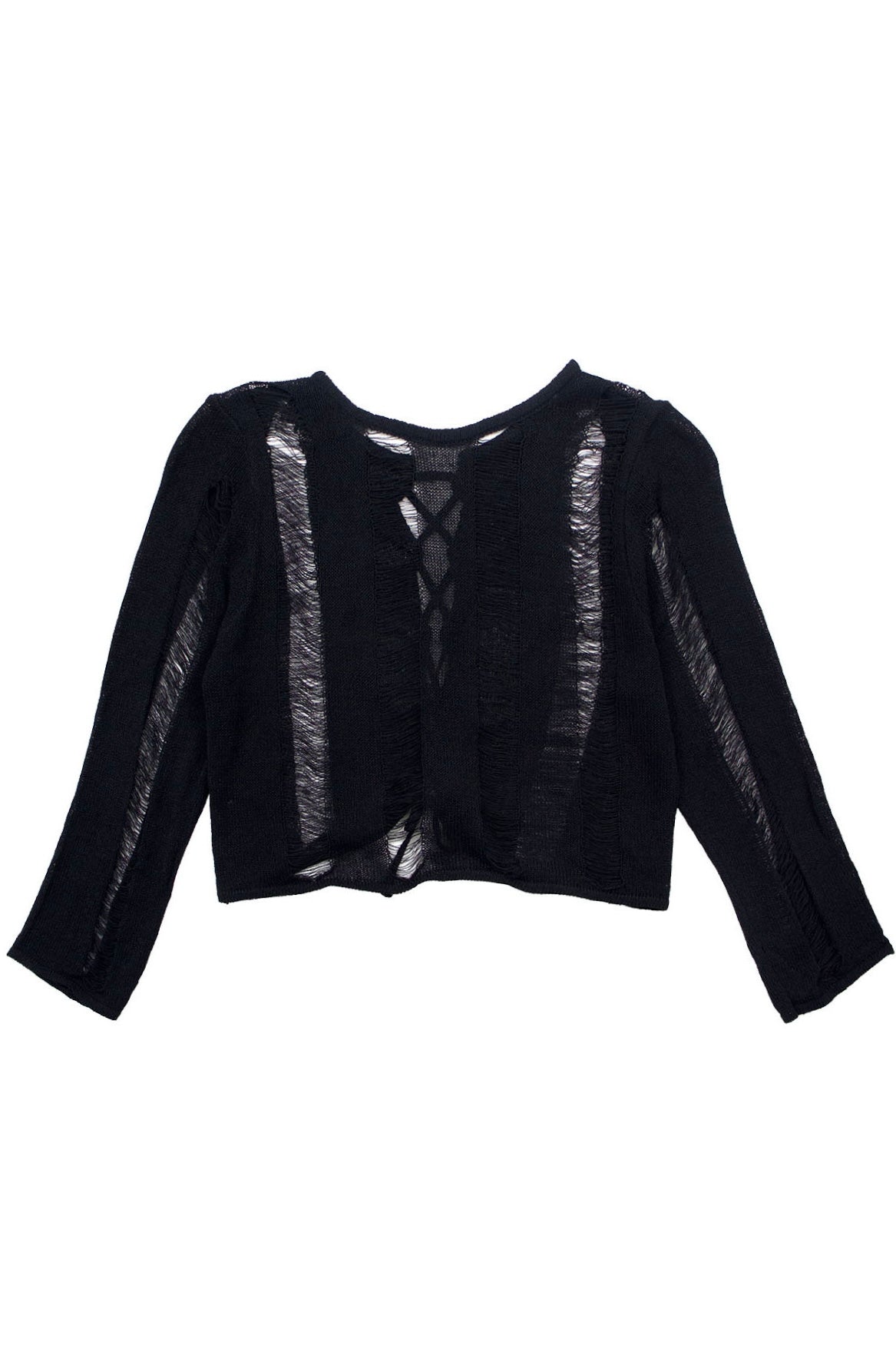 Distressed knit top with open weave long sleeve. Round neckline, lace up back design.