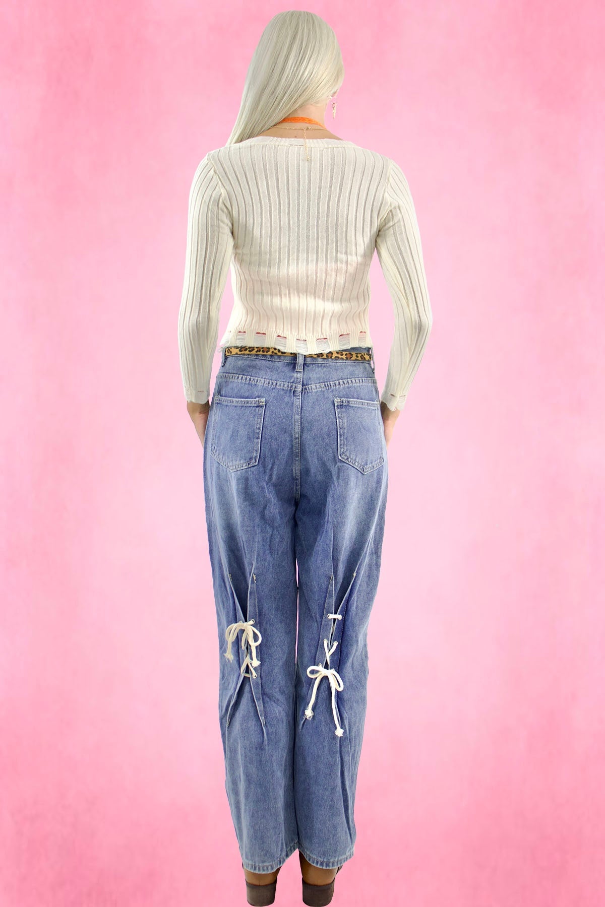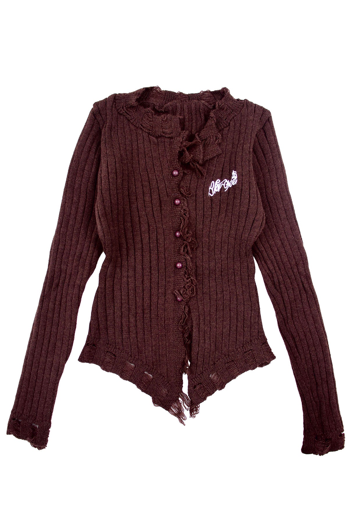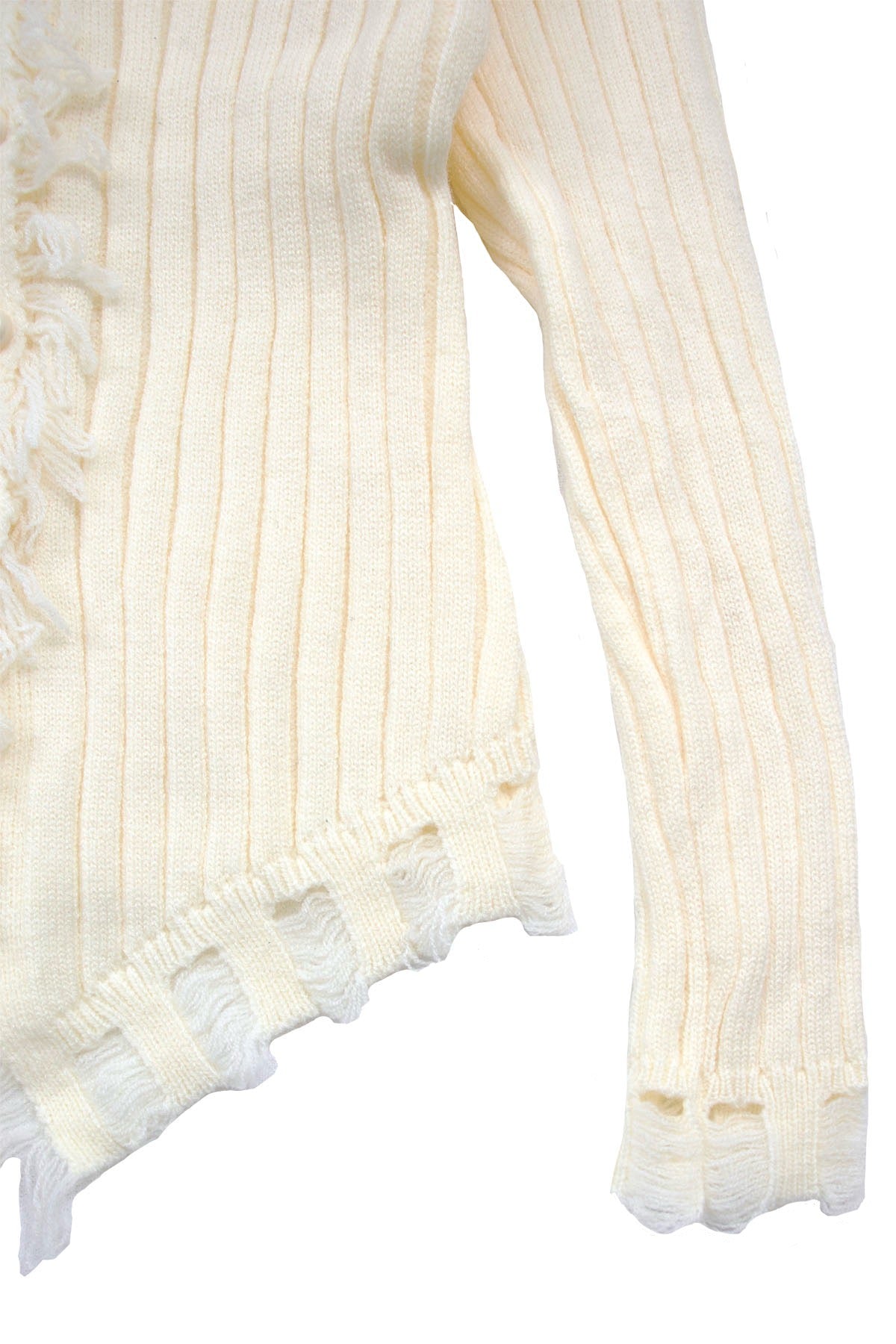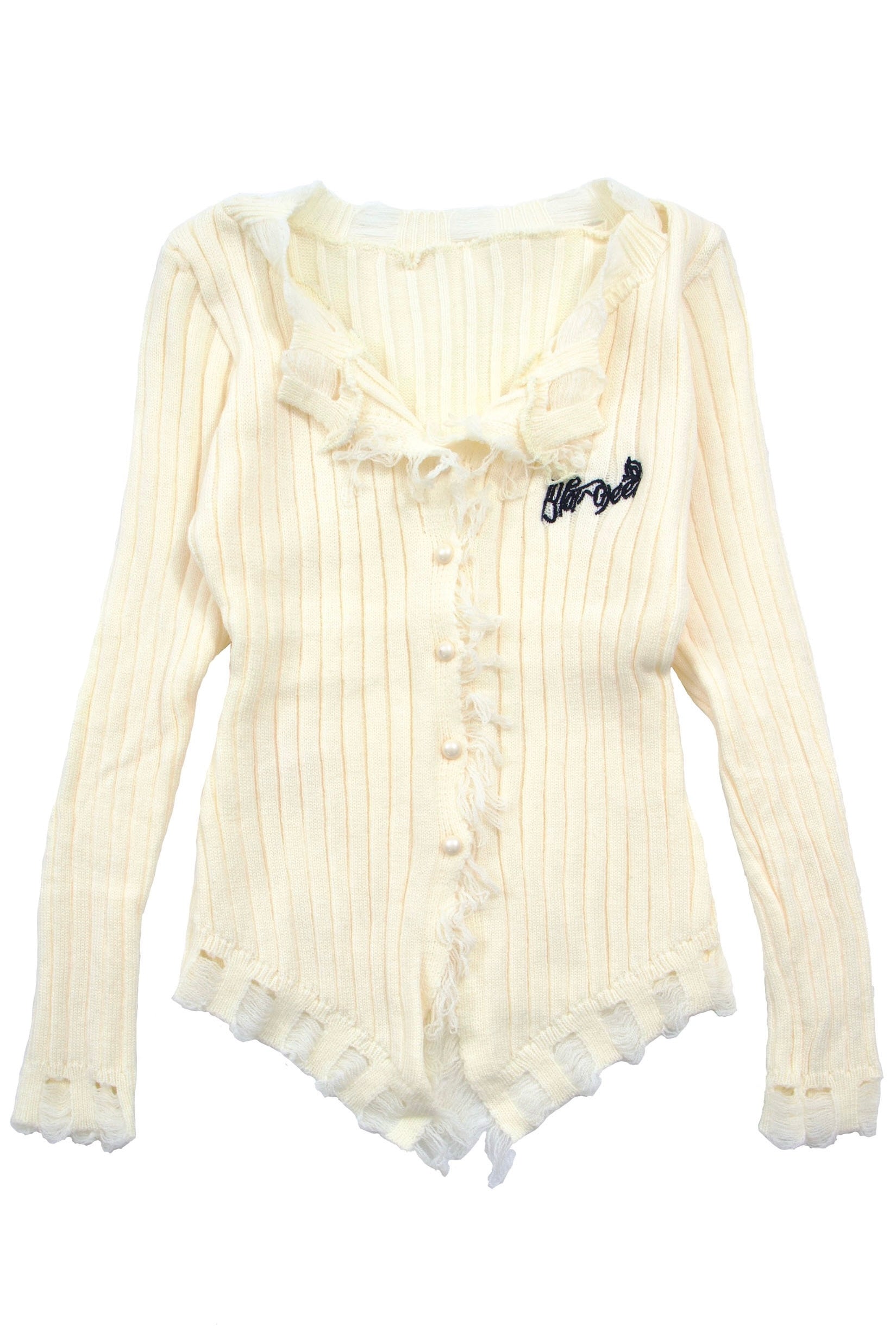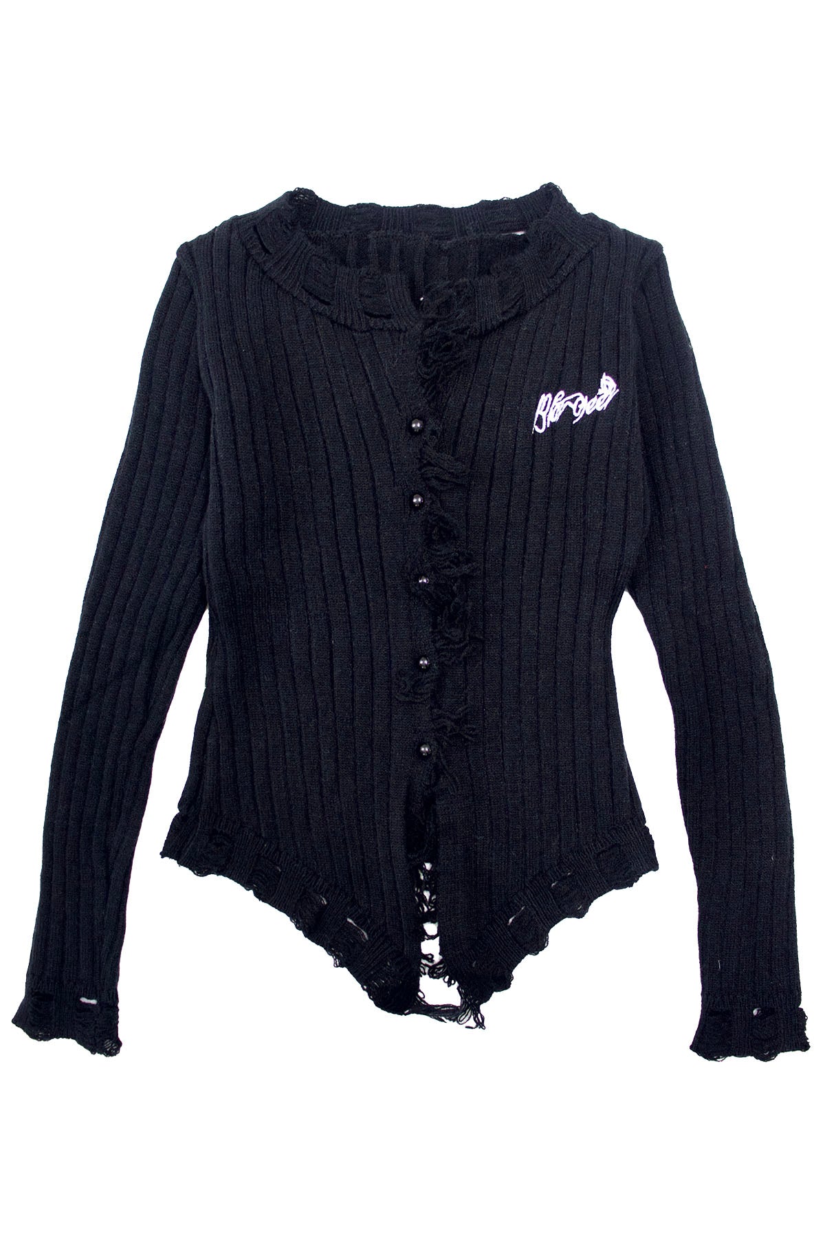 V-neck distressed hem cardigan. Made with soft ribbed knit material. Front button closure.