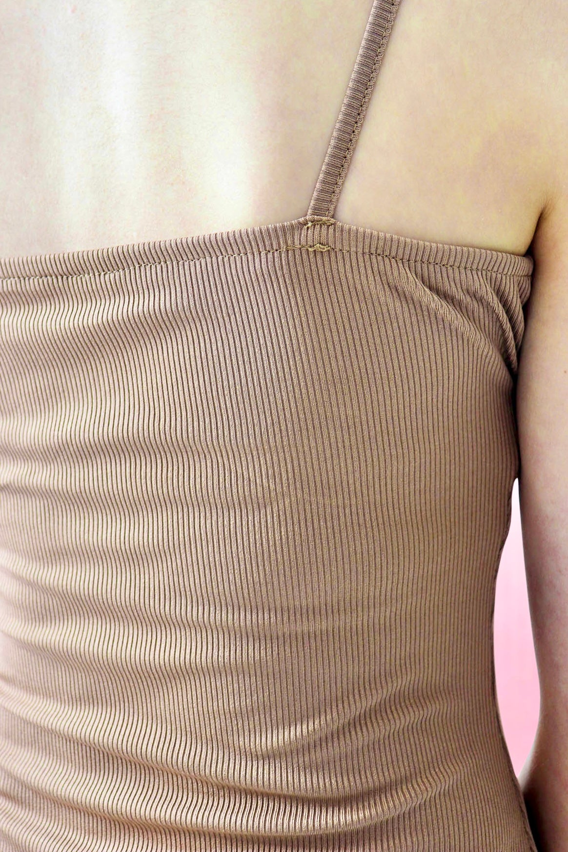 V-neck ribbed stretch mini dress with adjustable ribbon strap. Gathering bust cup design.