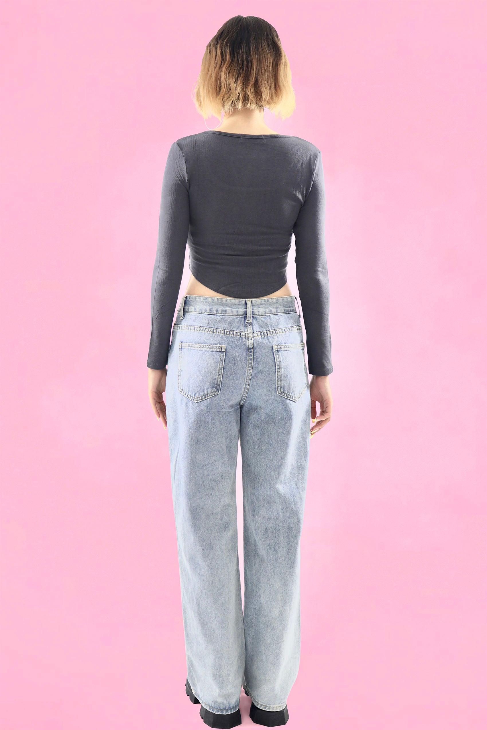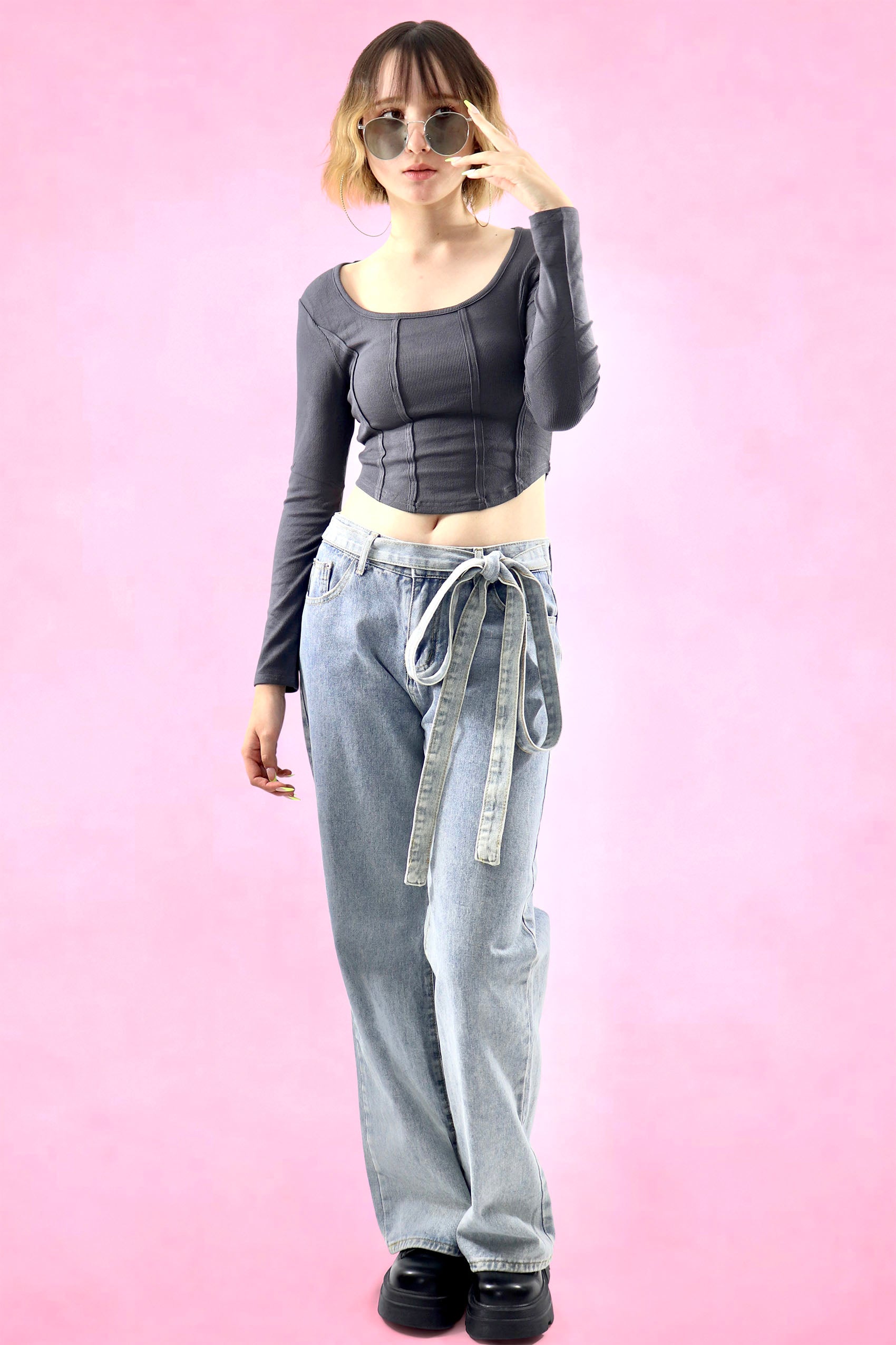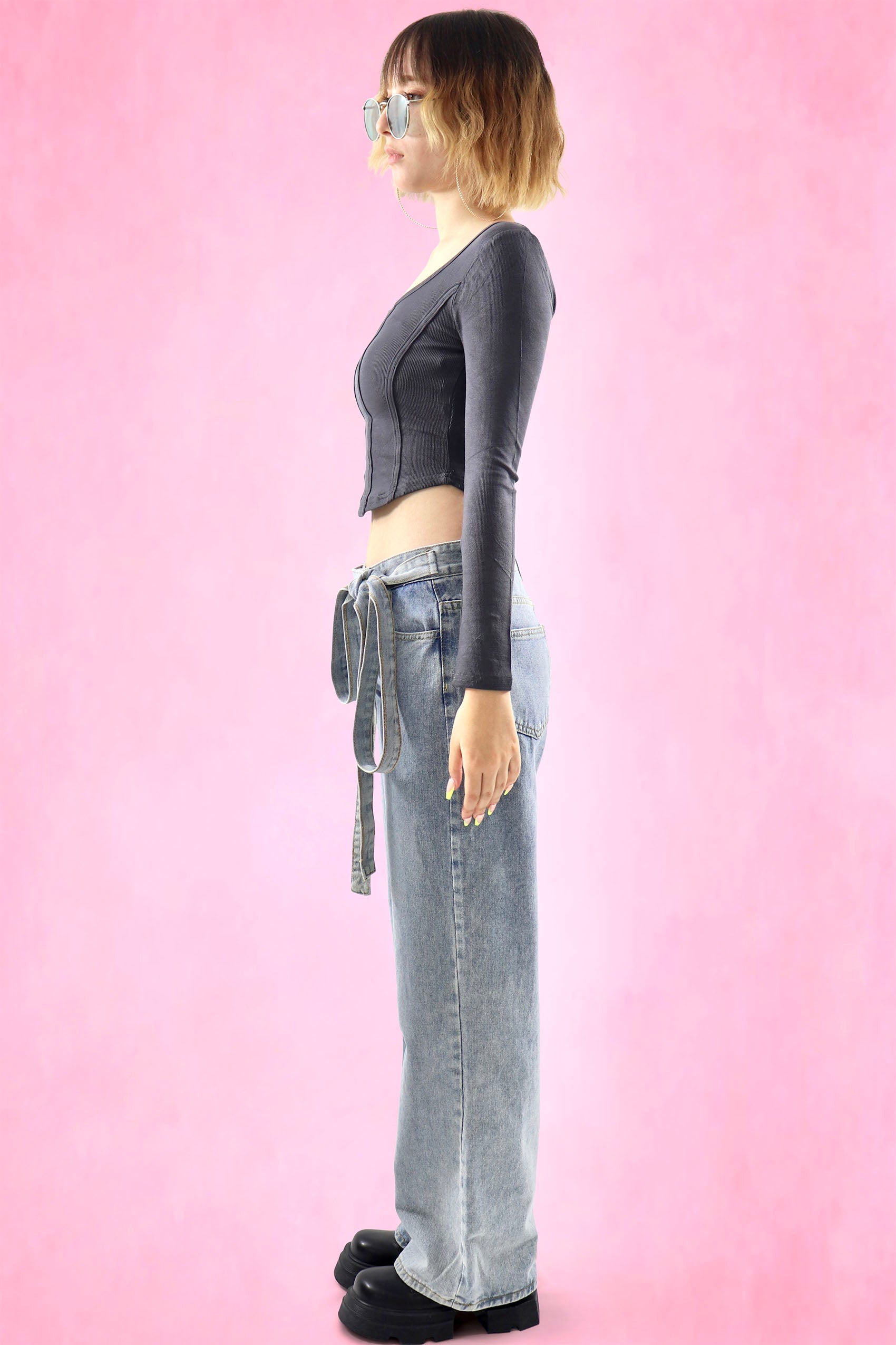 Mid-rise jeans with tie-waist can be big ribbon or cross around the waist. Pockets on the front and back. Zip fly with button closure.