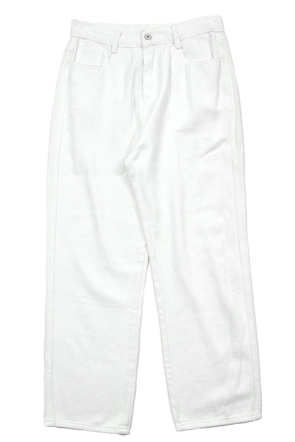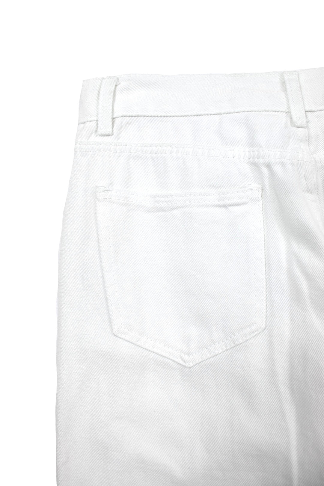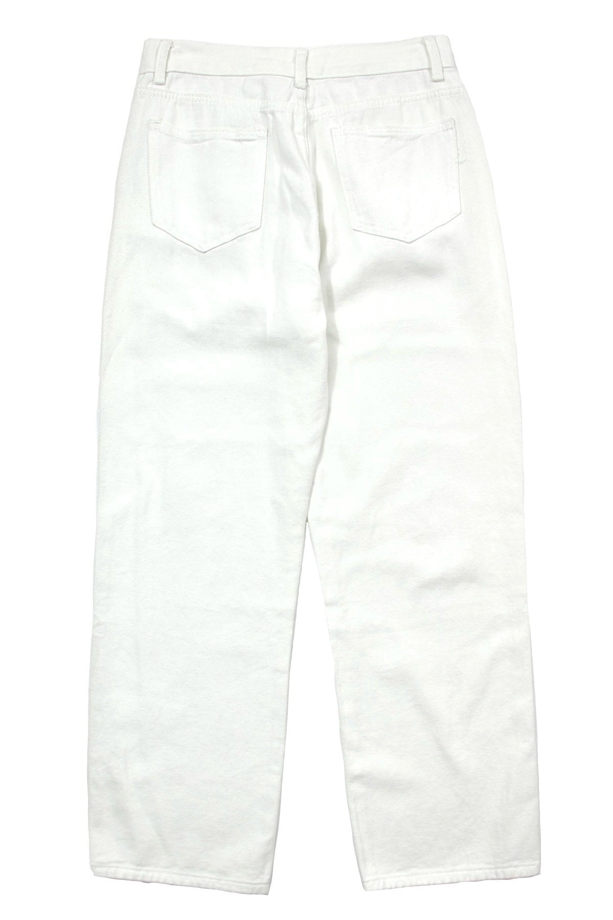 White long denim pants with 5 pockets.  Belt loops on the waist. Zip fly with button.