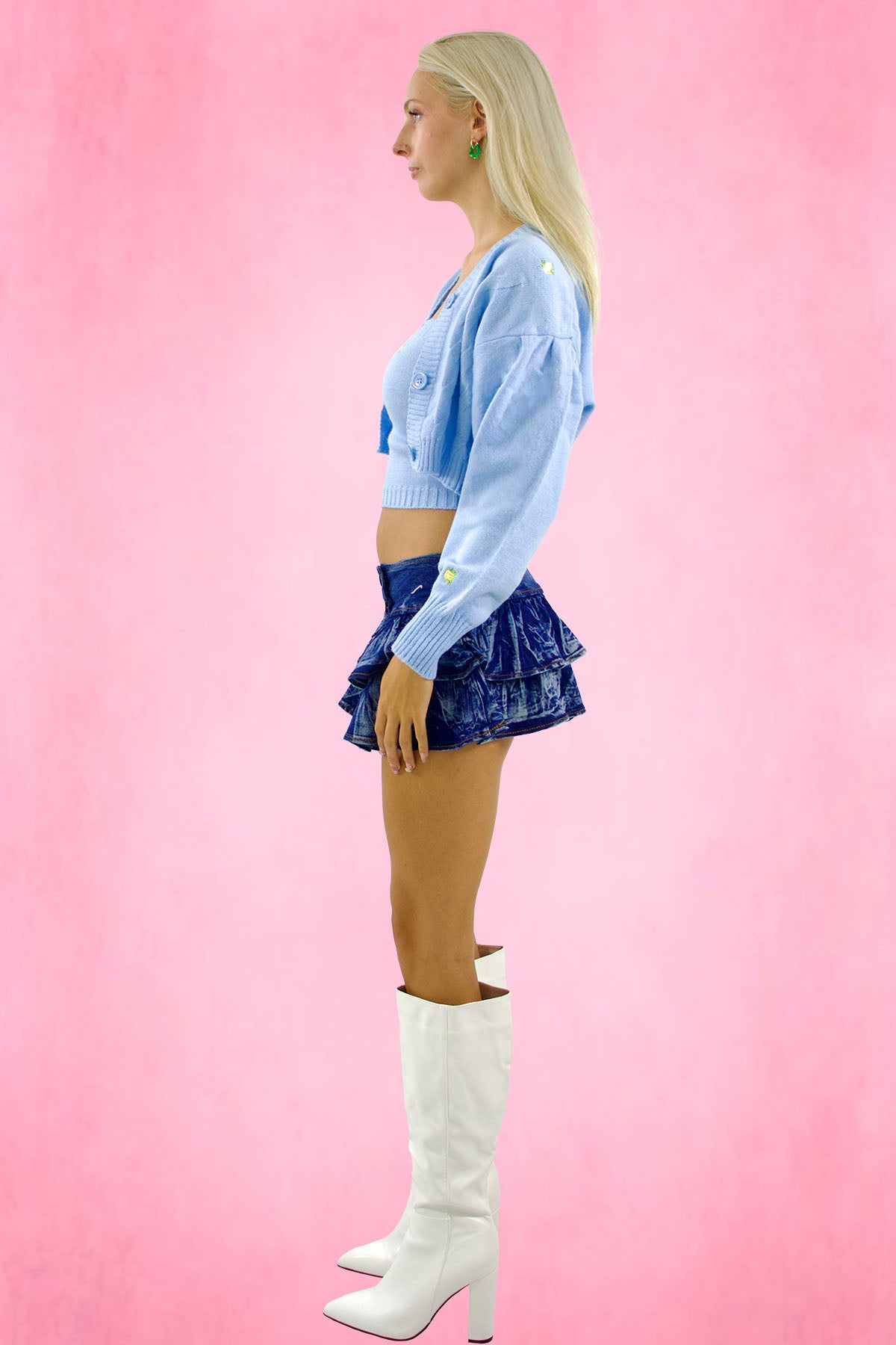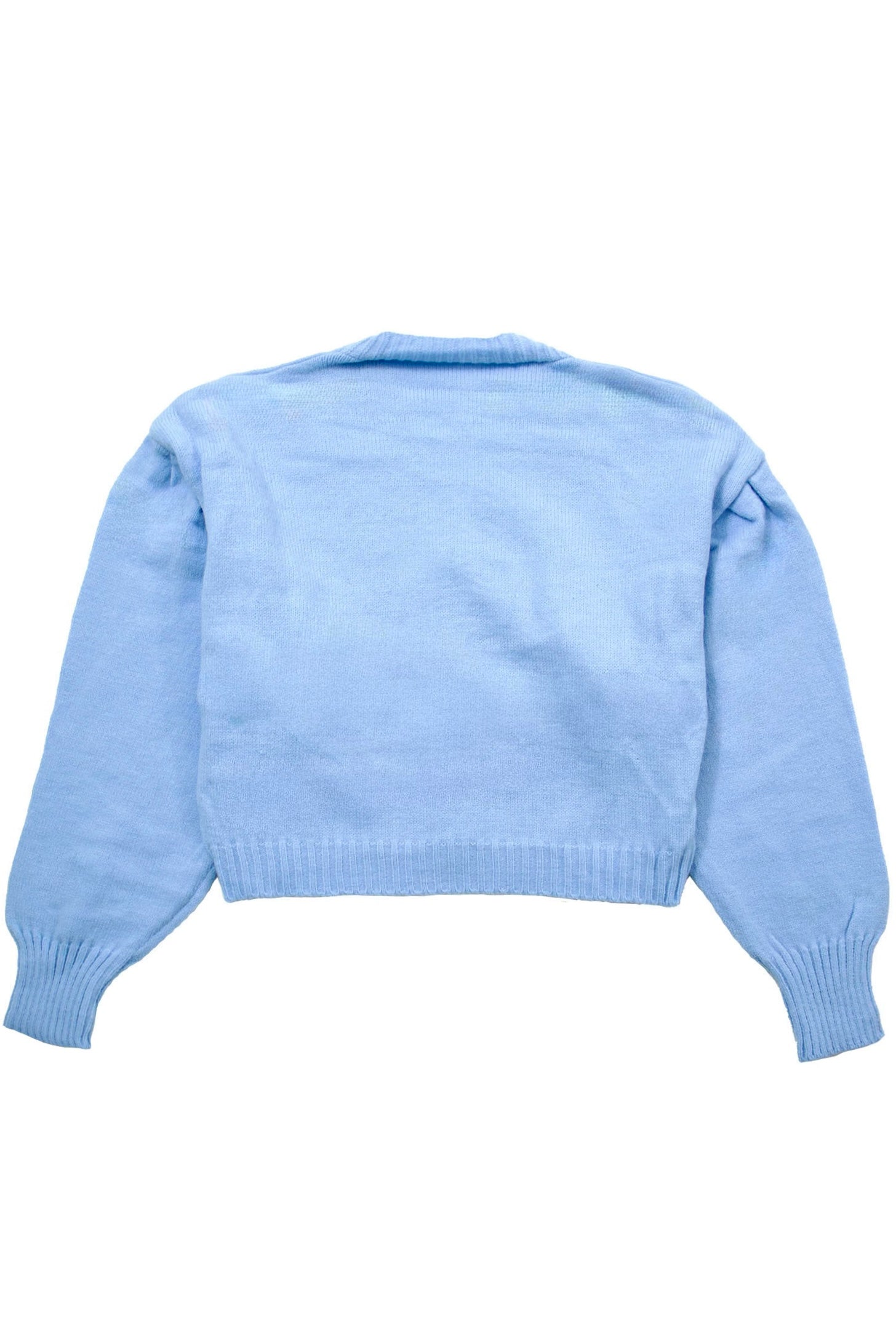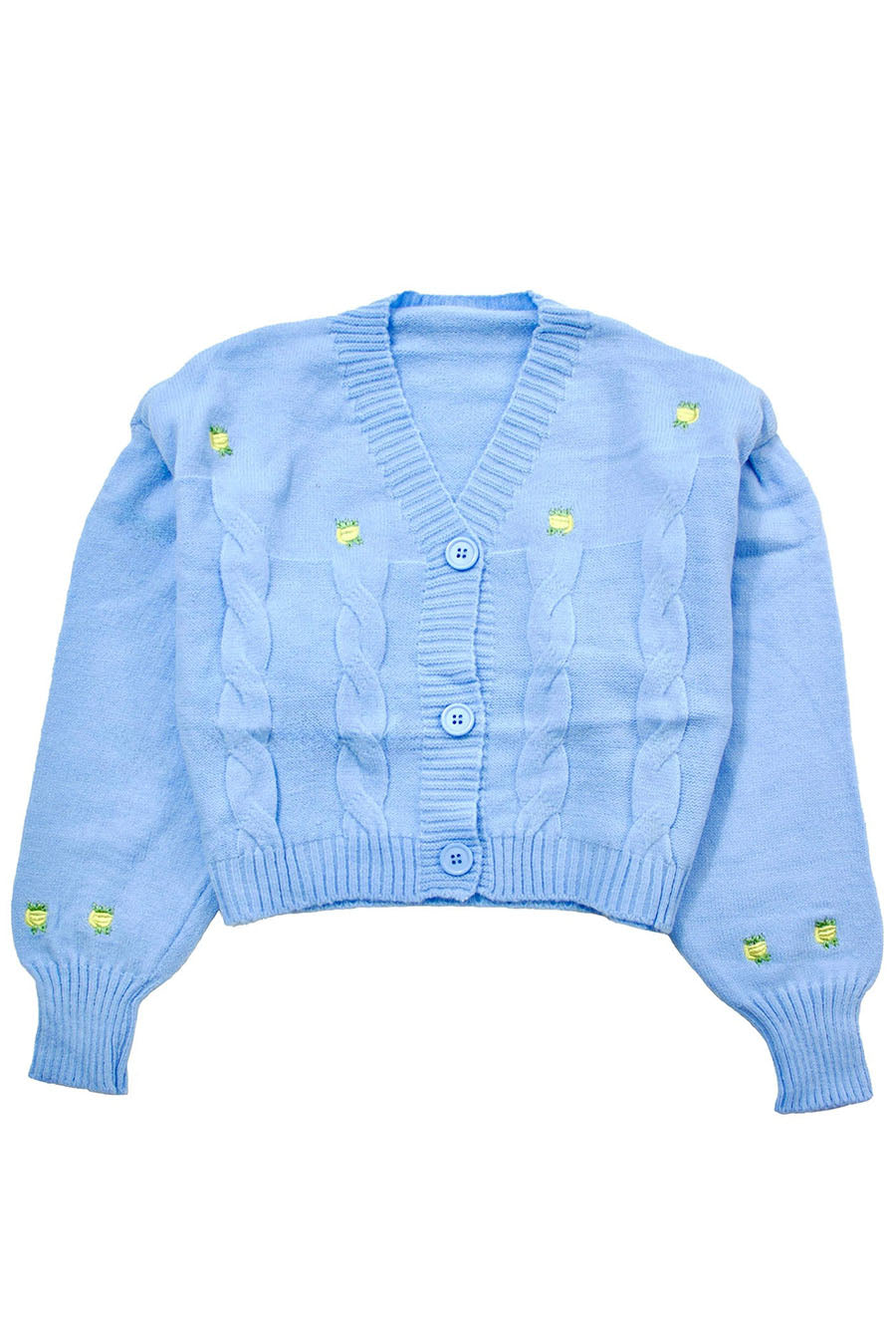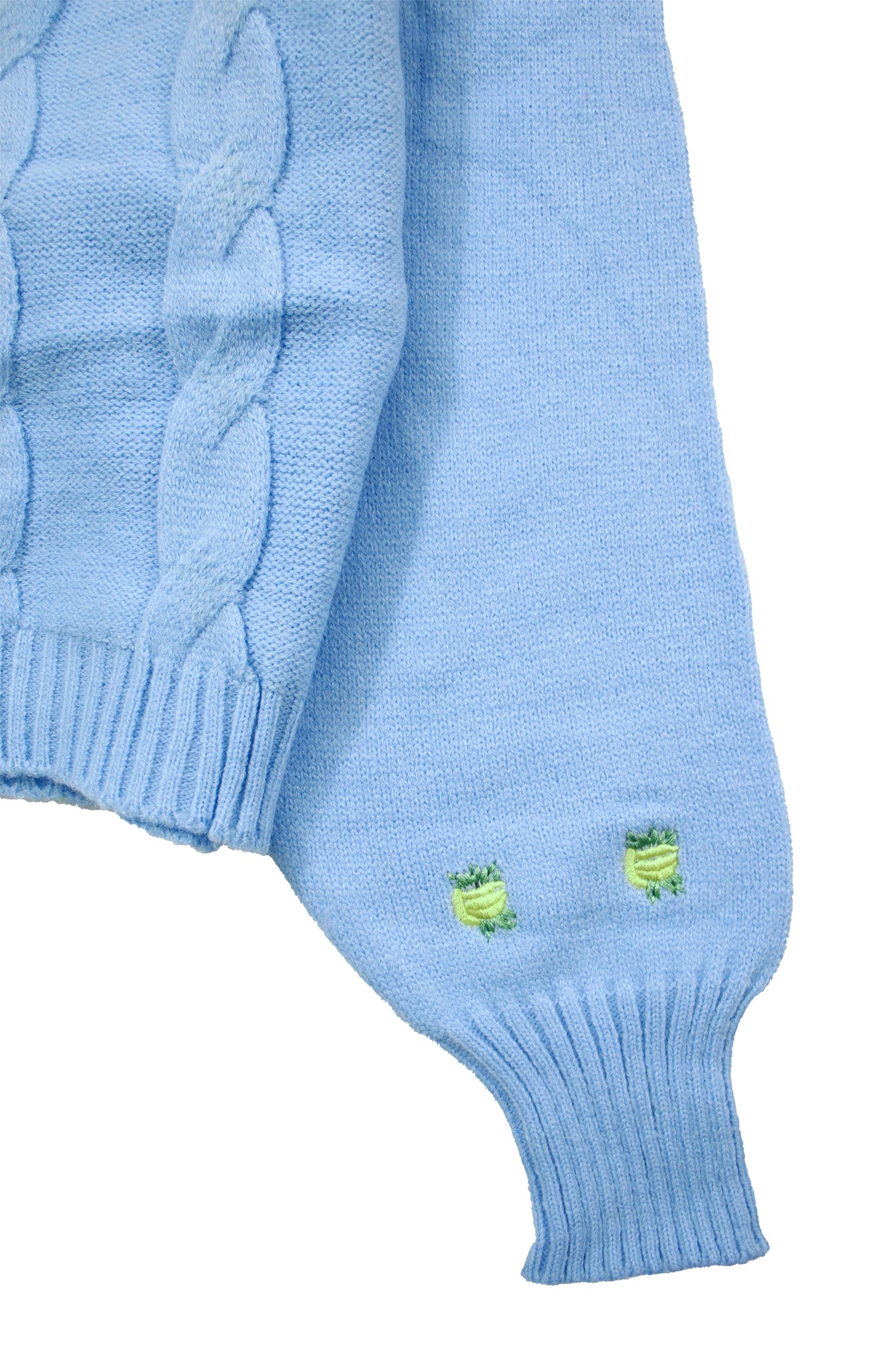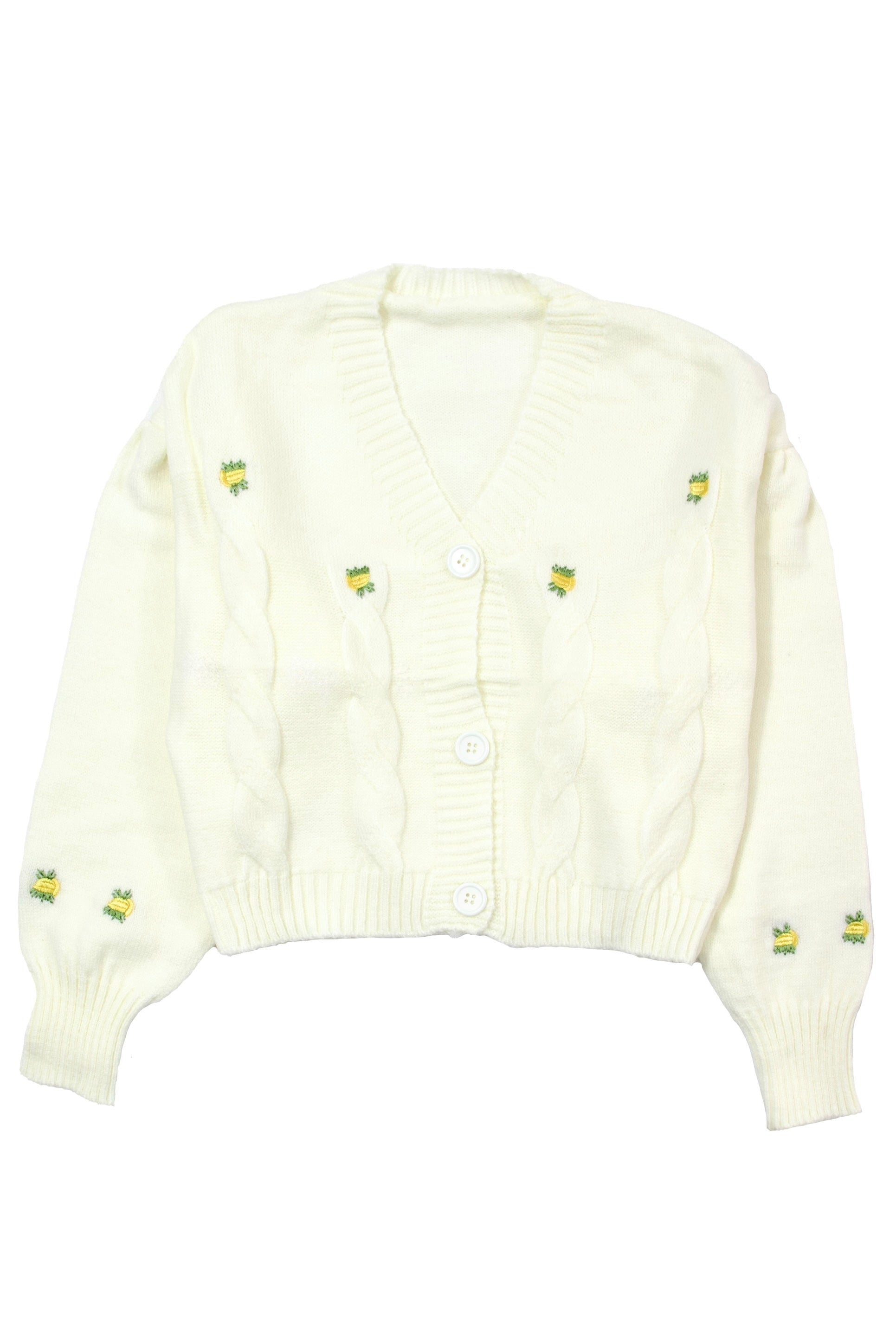V-neck cardigan with yellow flower embroidery motif. Long sleeves with ribbed hem. Front button closure.