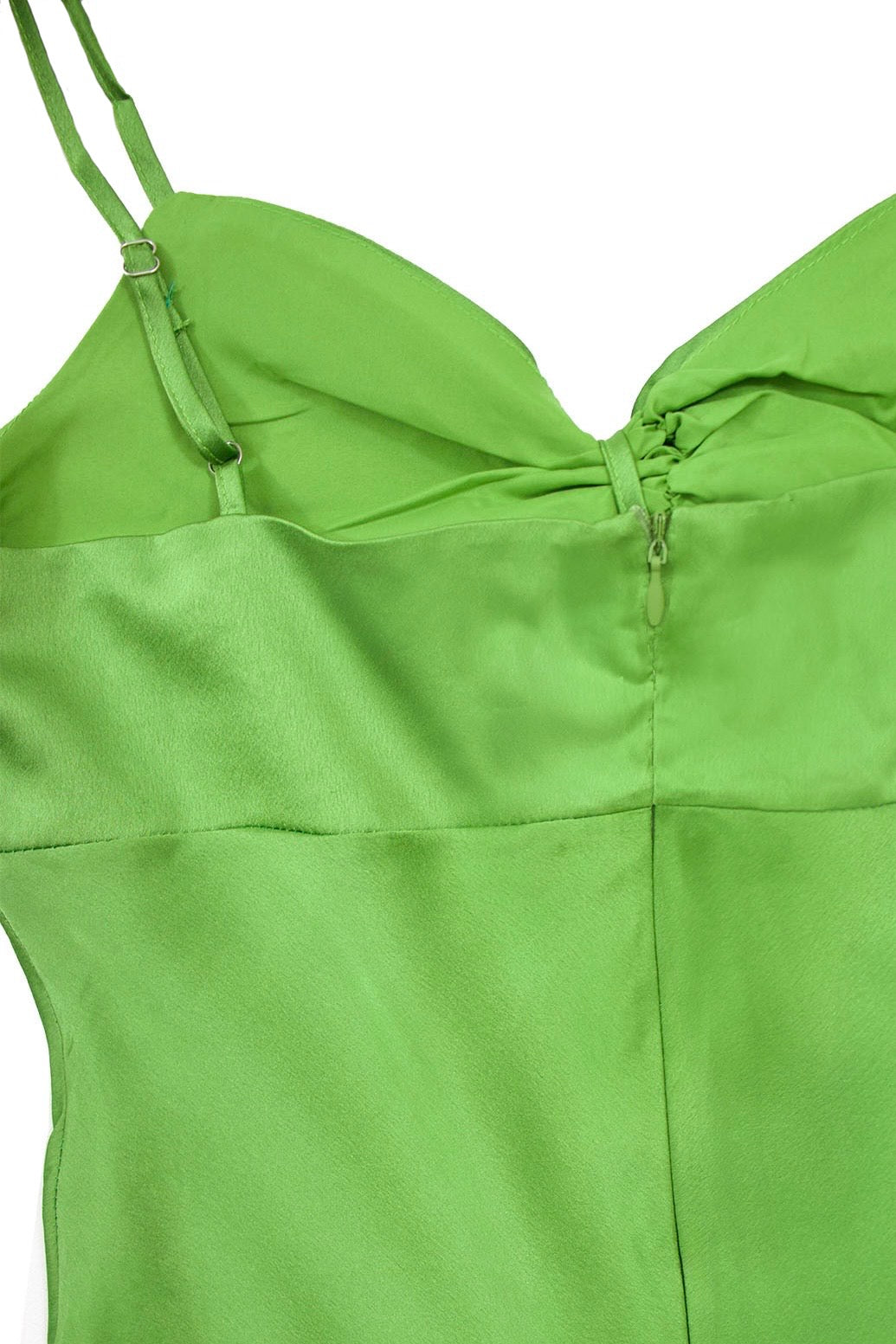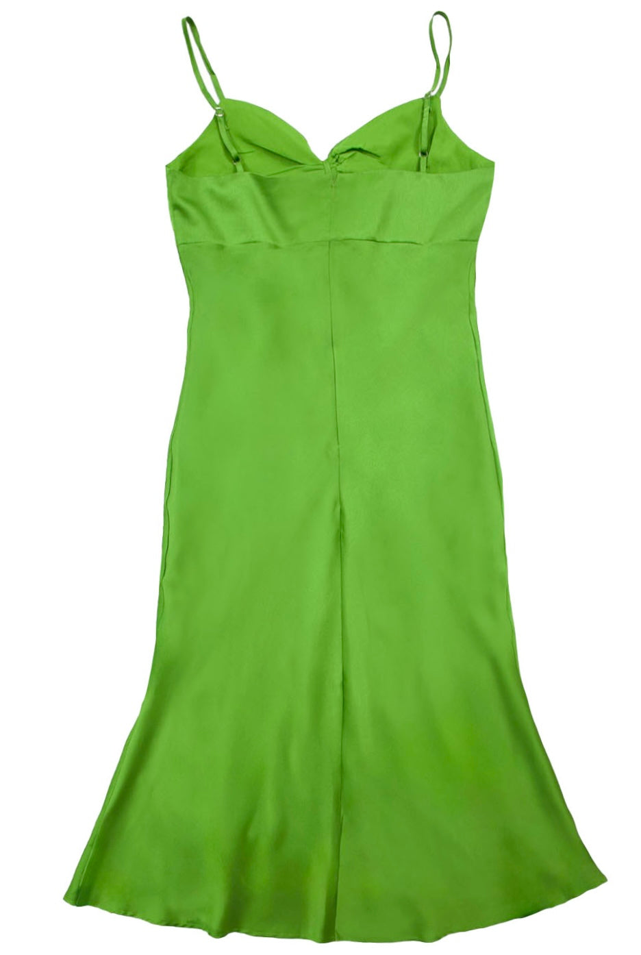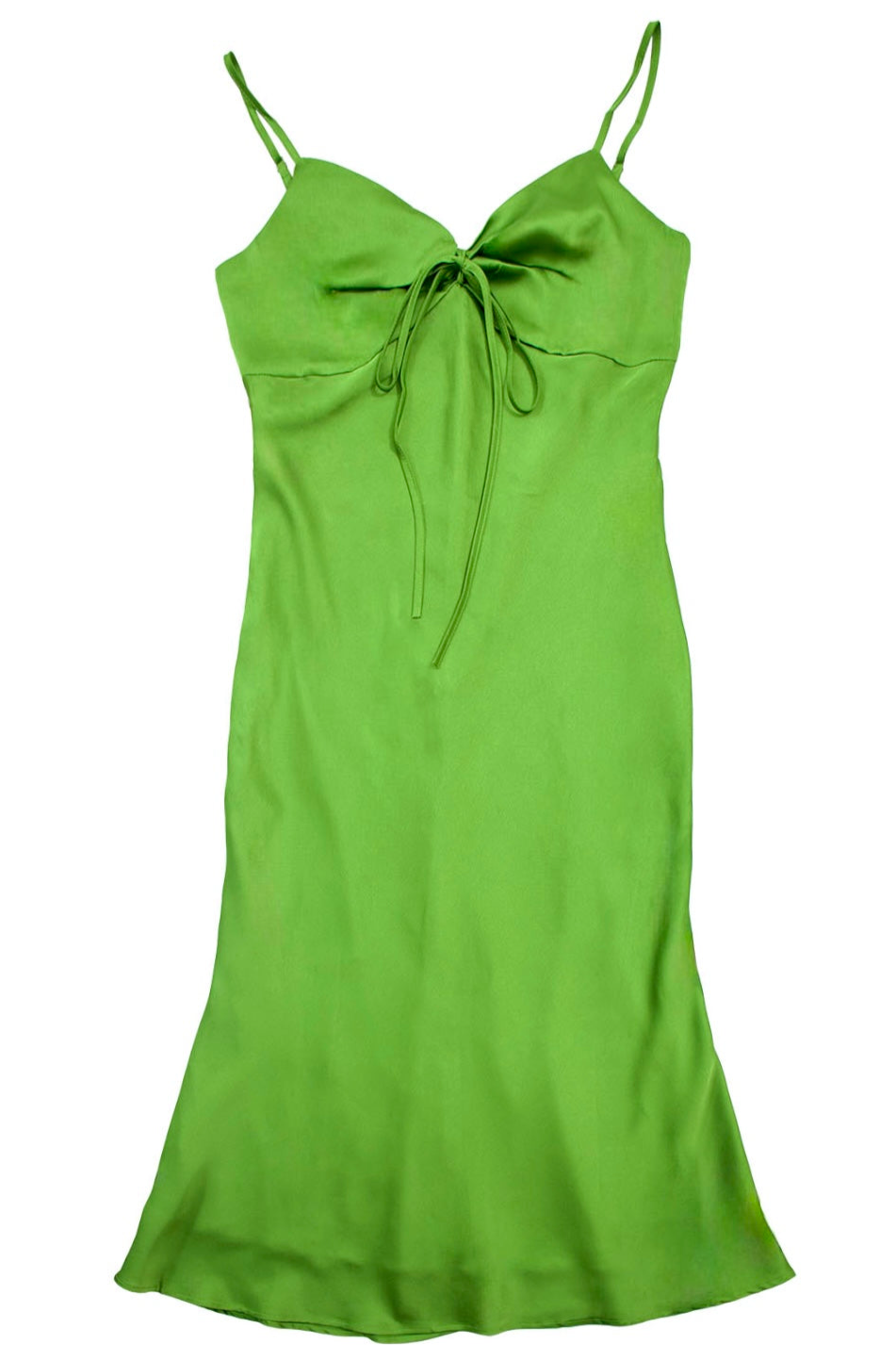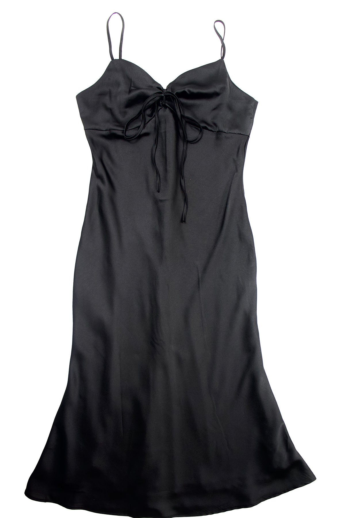 Satin midi flare dress with spaghetti straps. String on the front could be ribbon or halter. Adjustable straps. Zipper on the back.