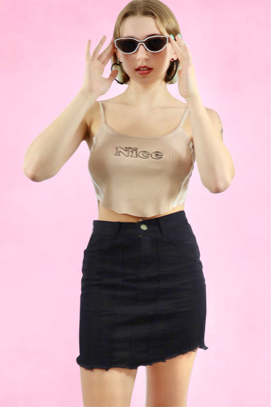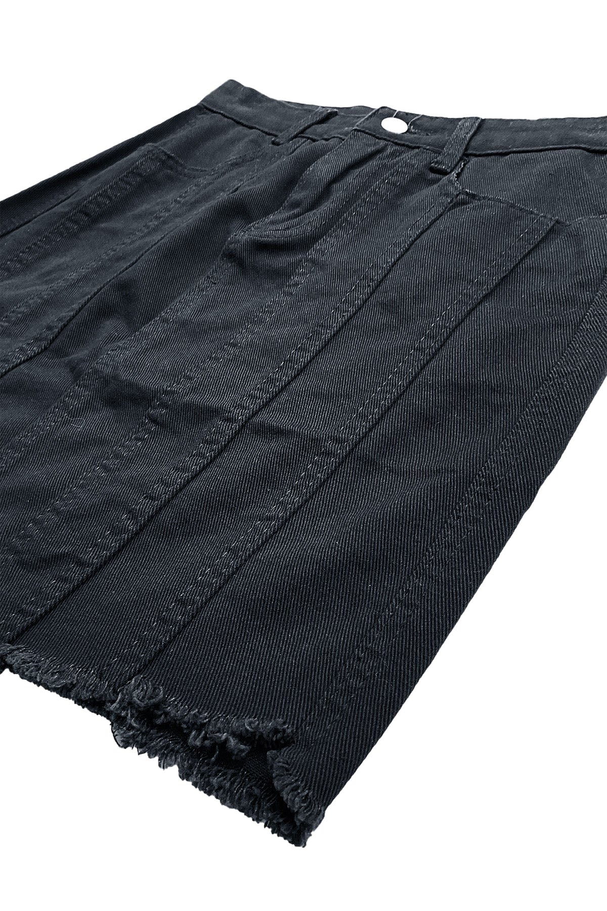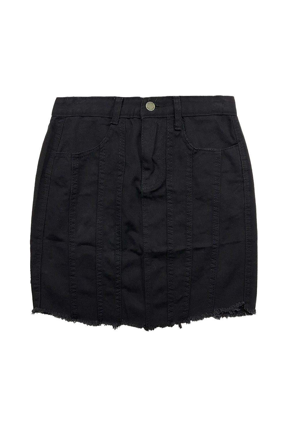Black Denim H-Line Mini Skirt with Side Front Pocket. Zip Fly with Button. Cut Off Designed Hem.
