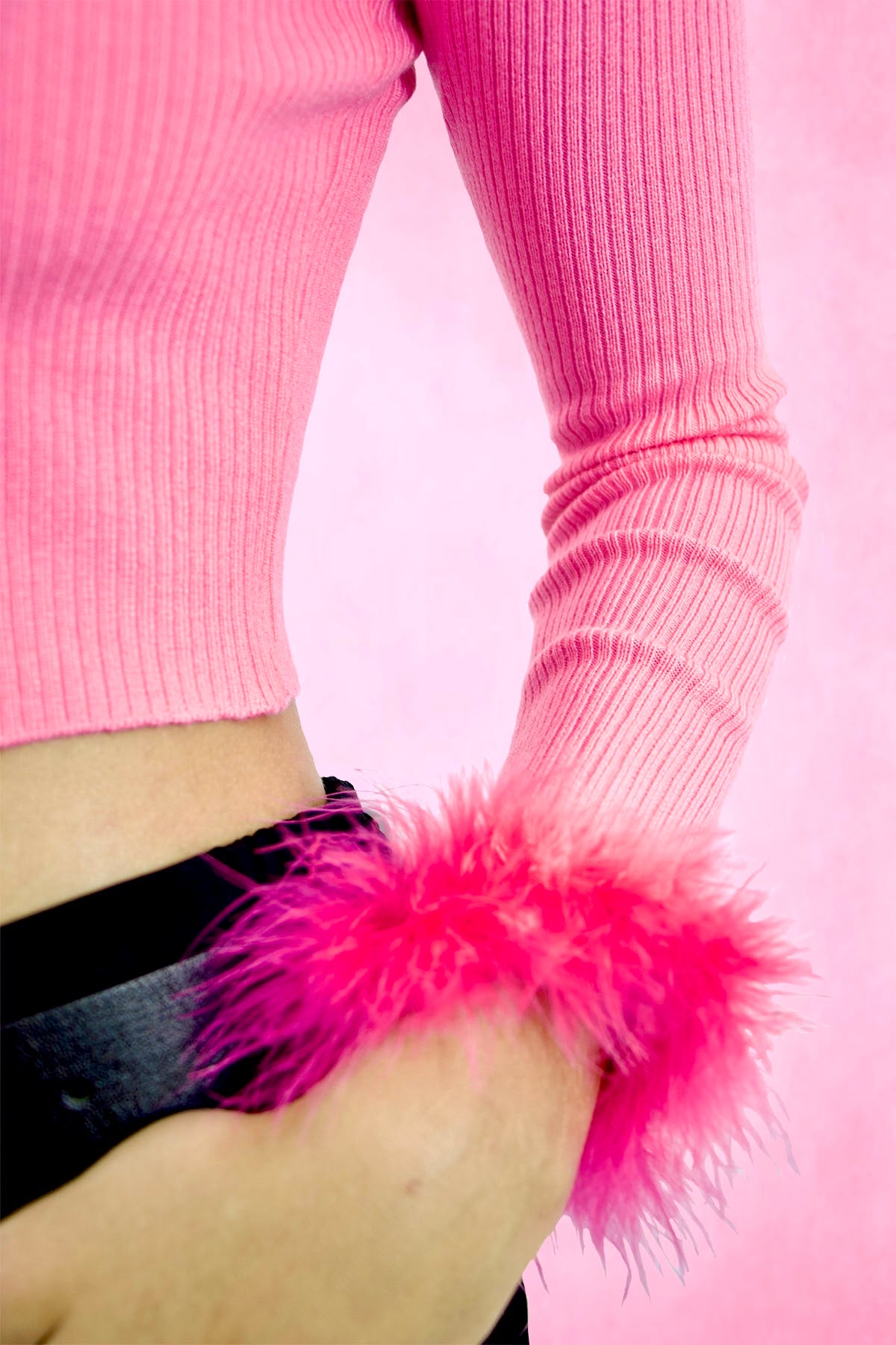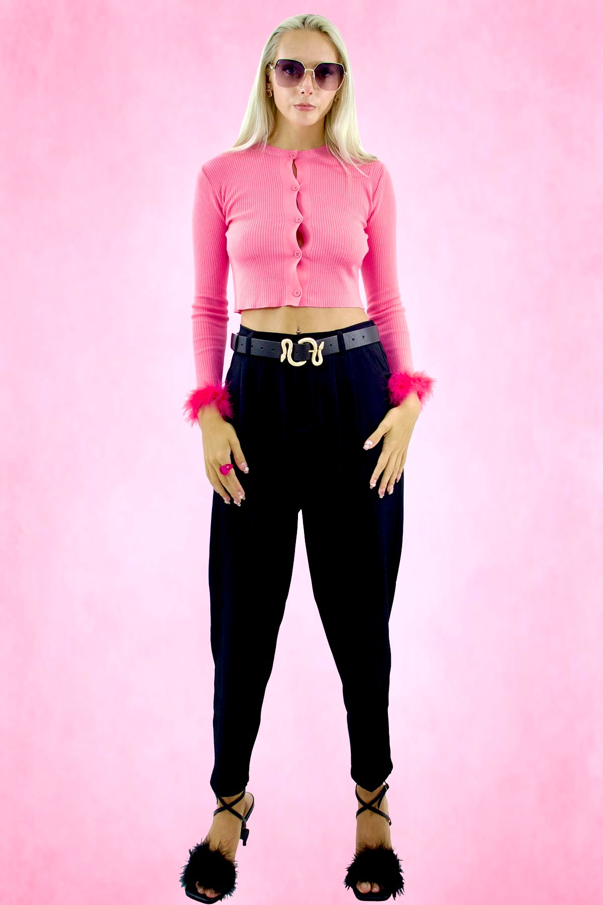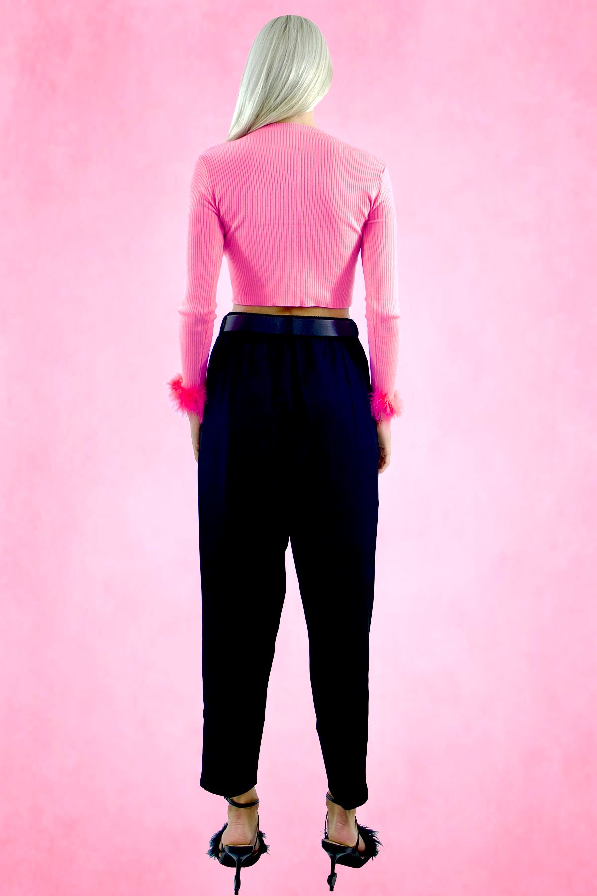 Mock neck ribbed knit crop cardigan. Feather trim on sleeves.