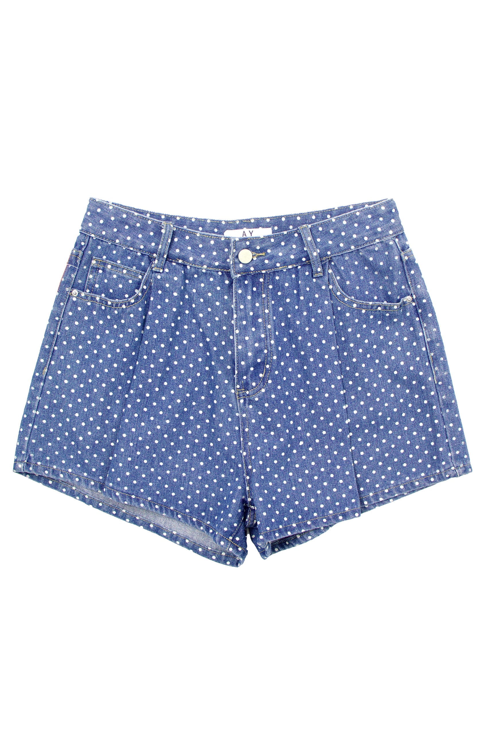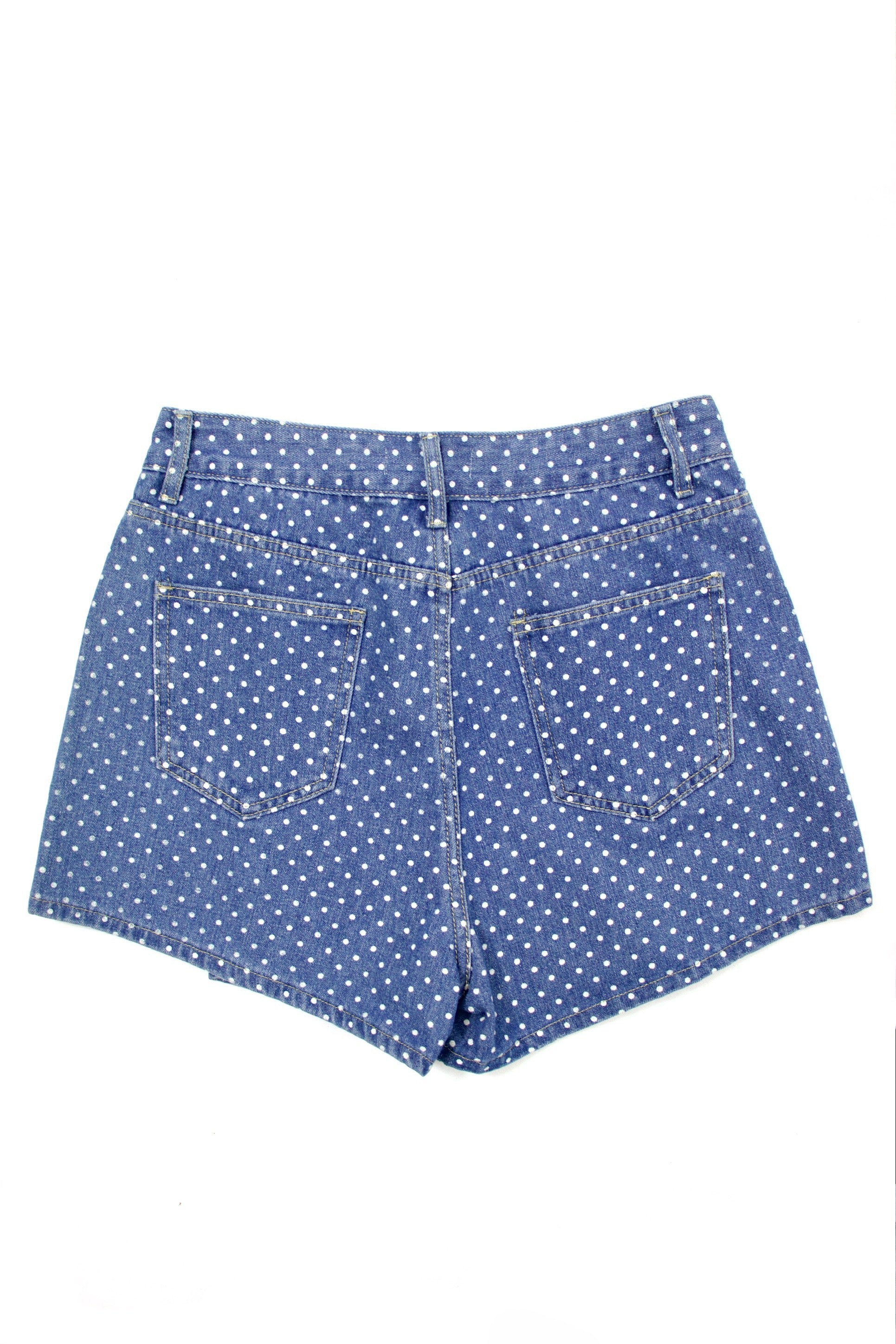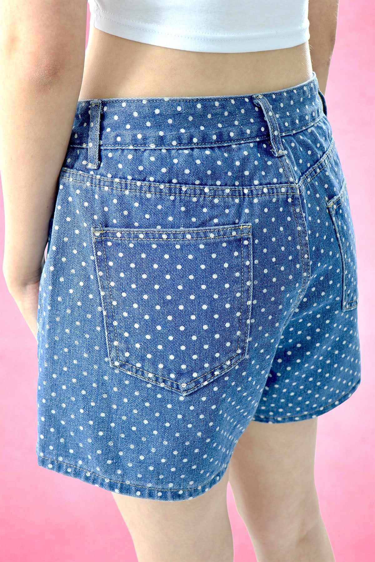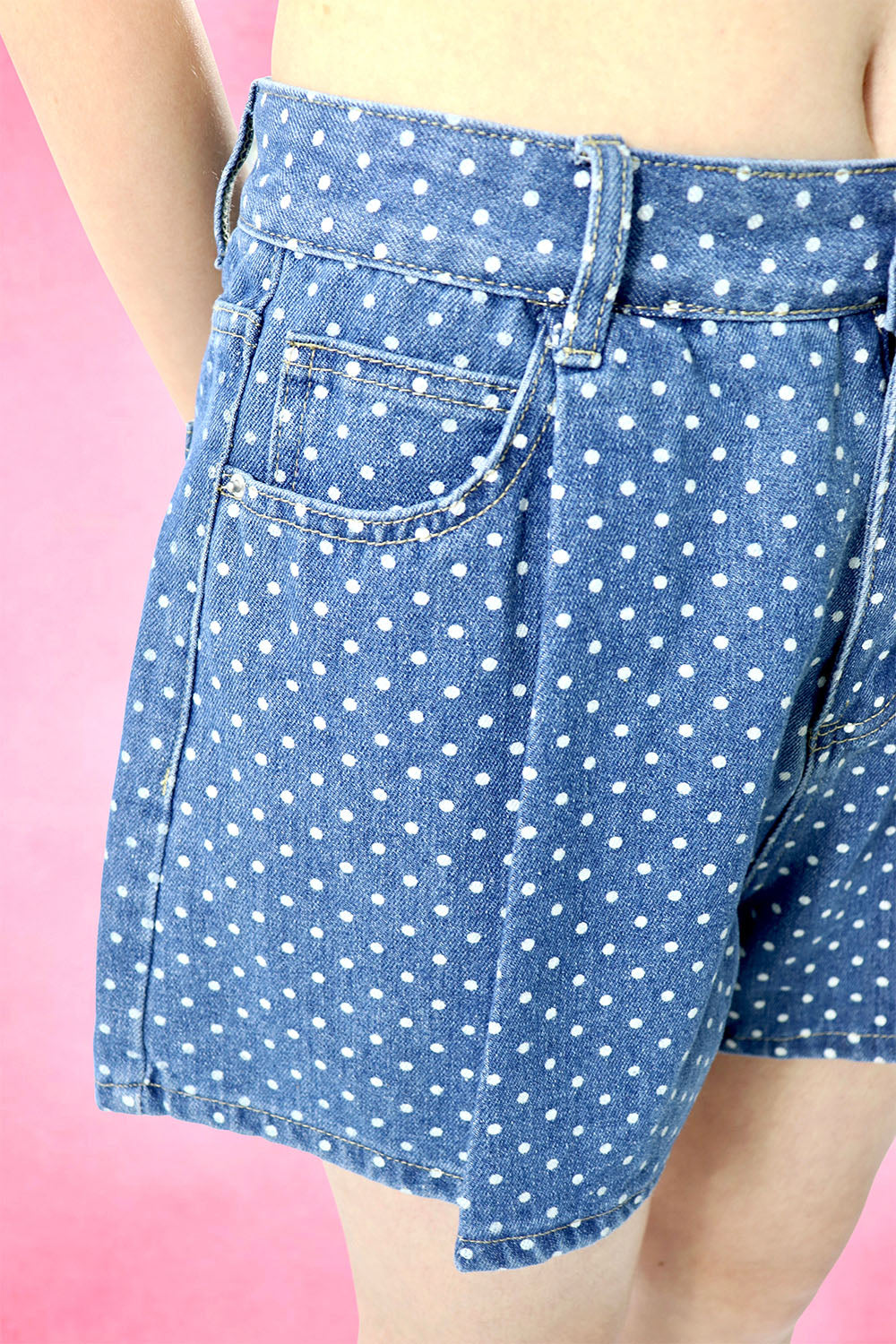 Polka dot flare denim shorts with 5 pockets. Zip fly with button on the front.