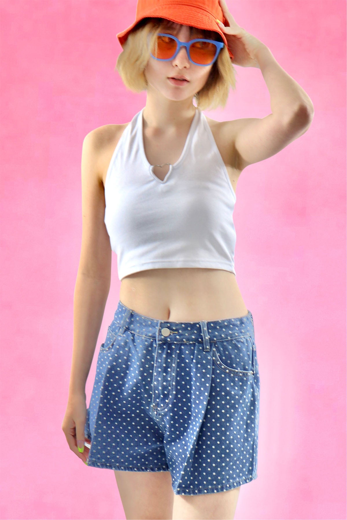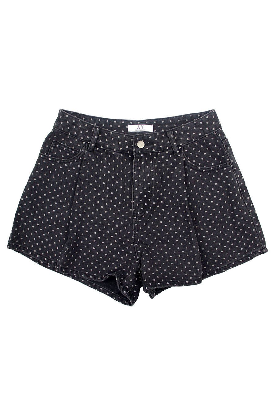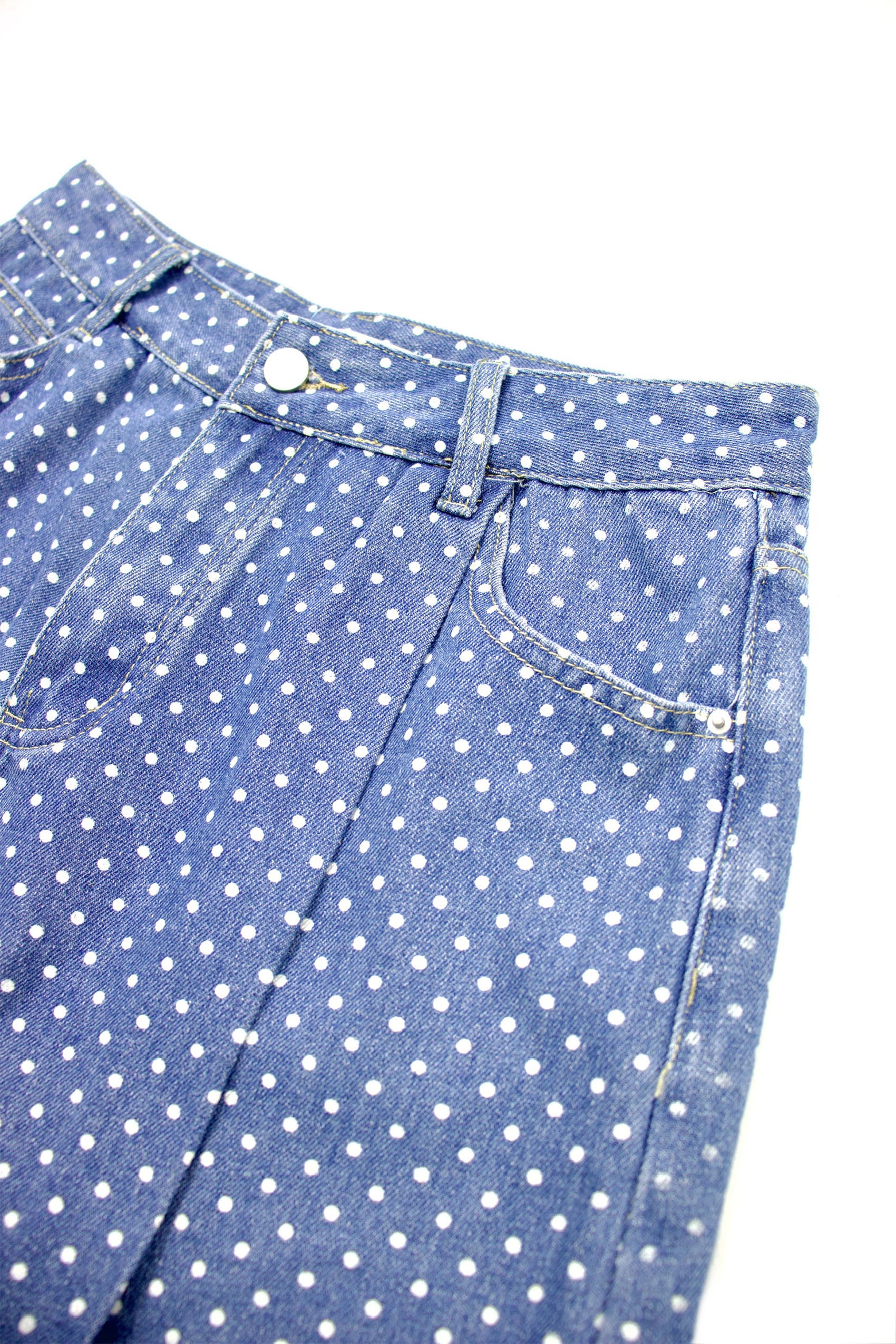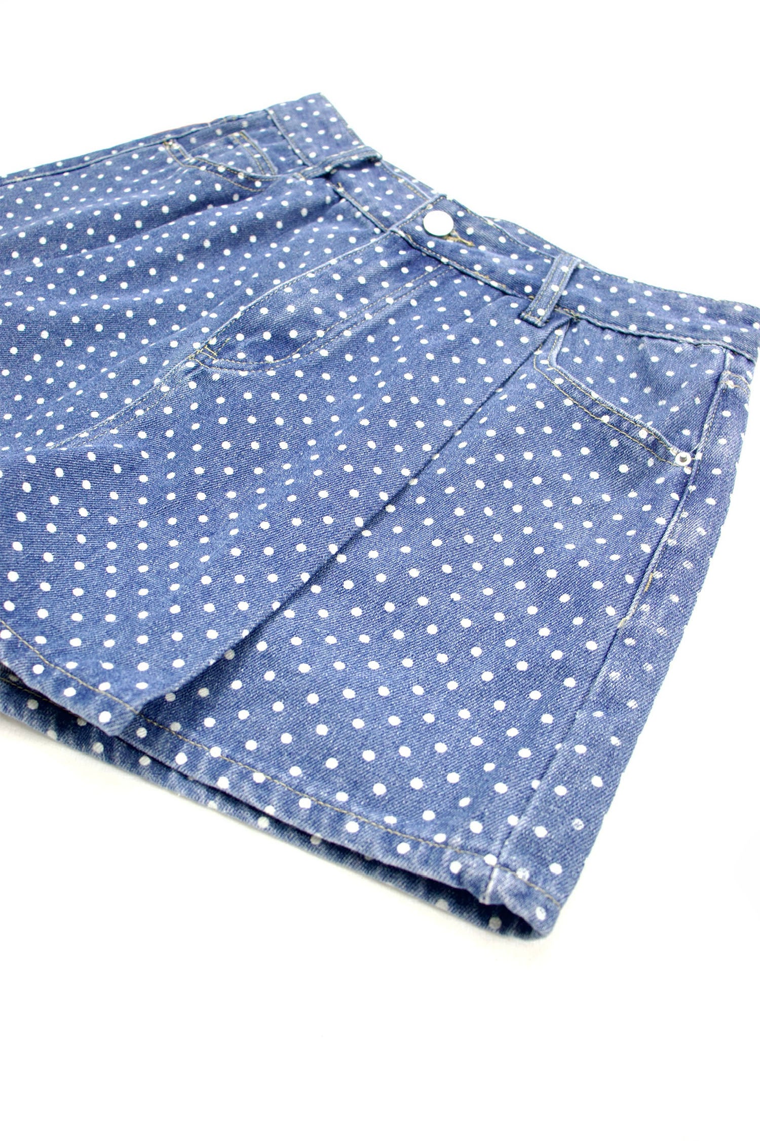 Polka dot flare denim shorts with 5 pockets. Zip fly with button on the front.