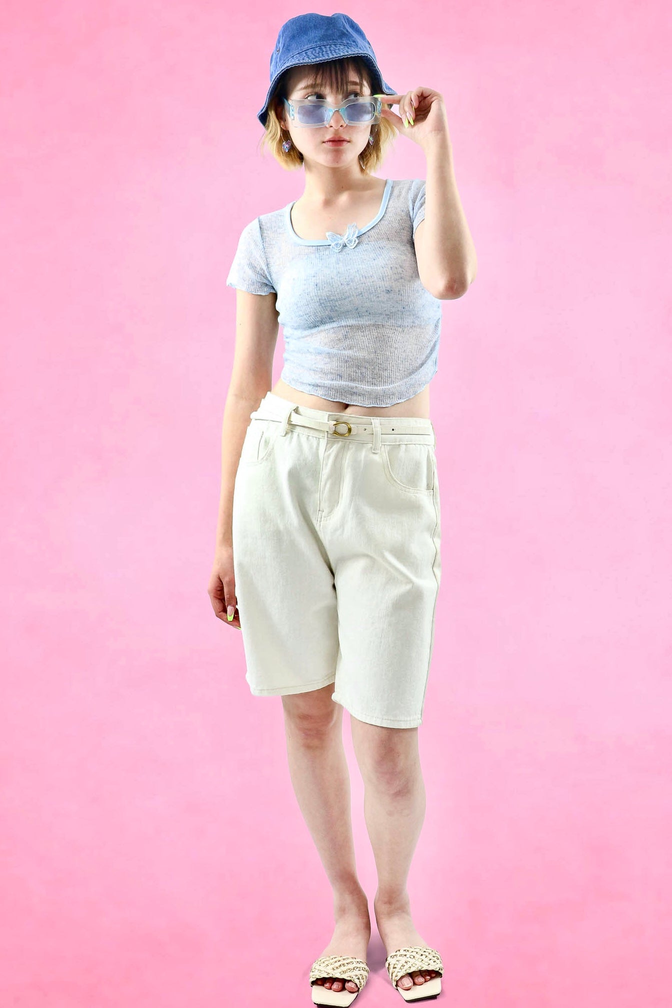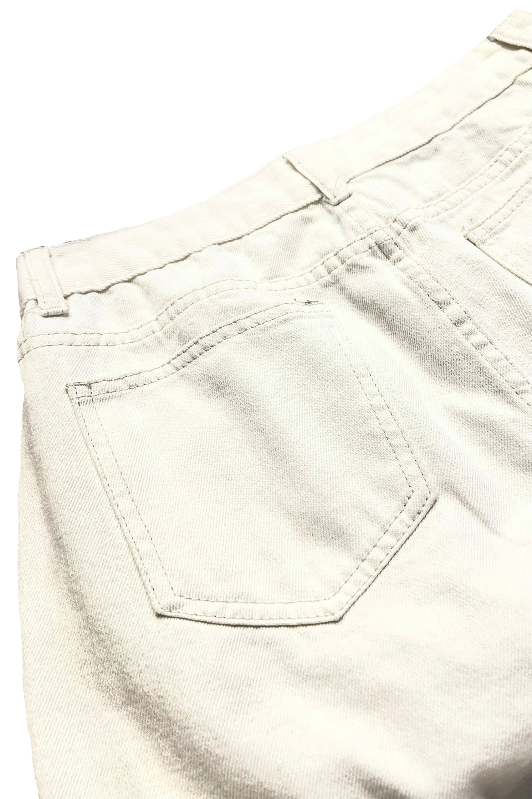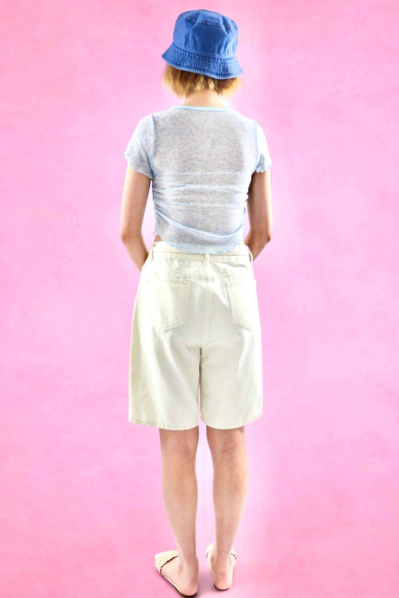White denim jorts with 5 pockets. Zipper fly and button closure.