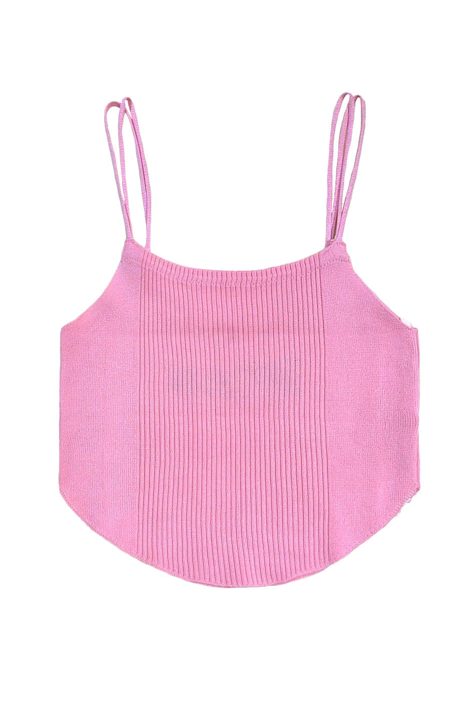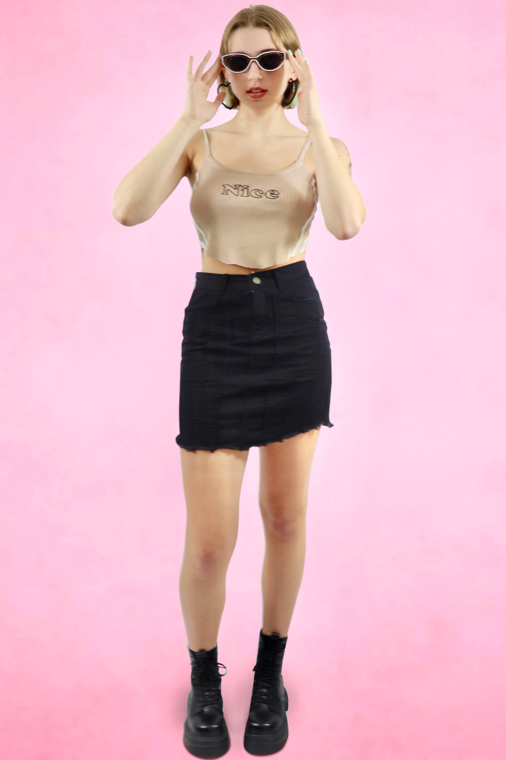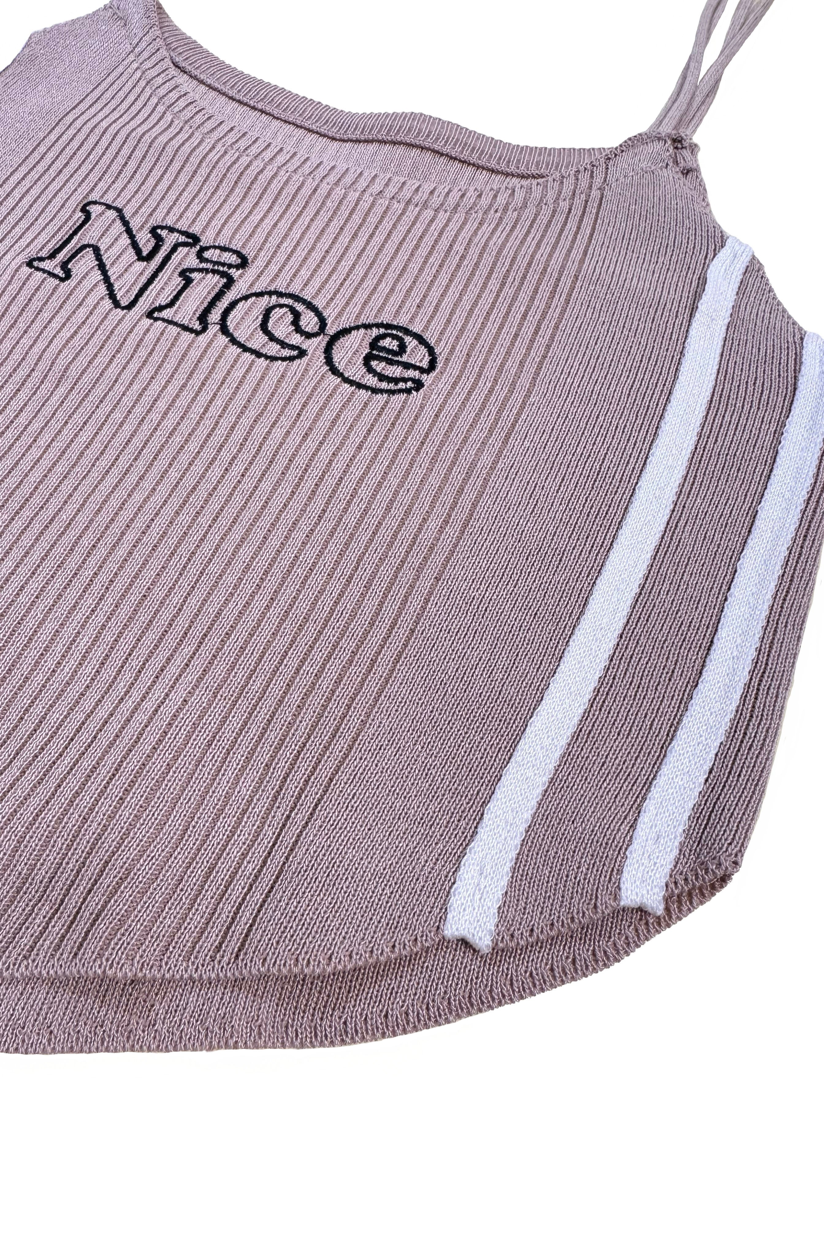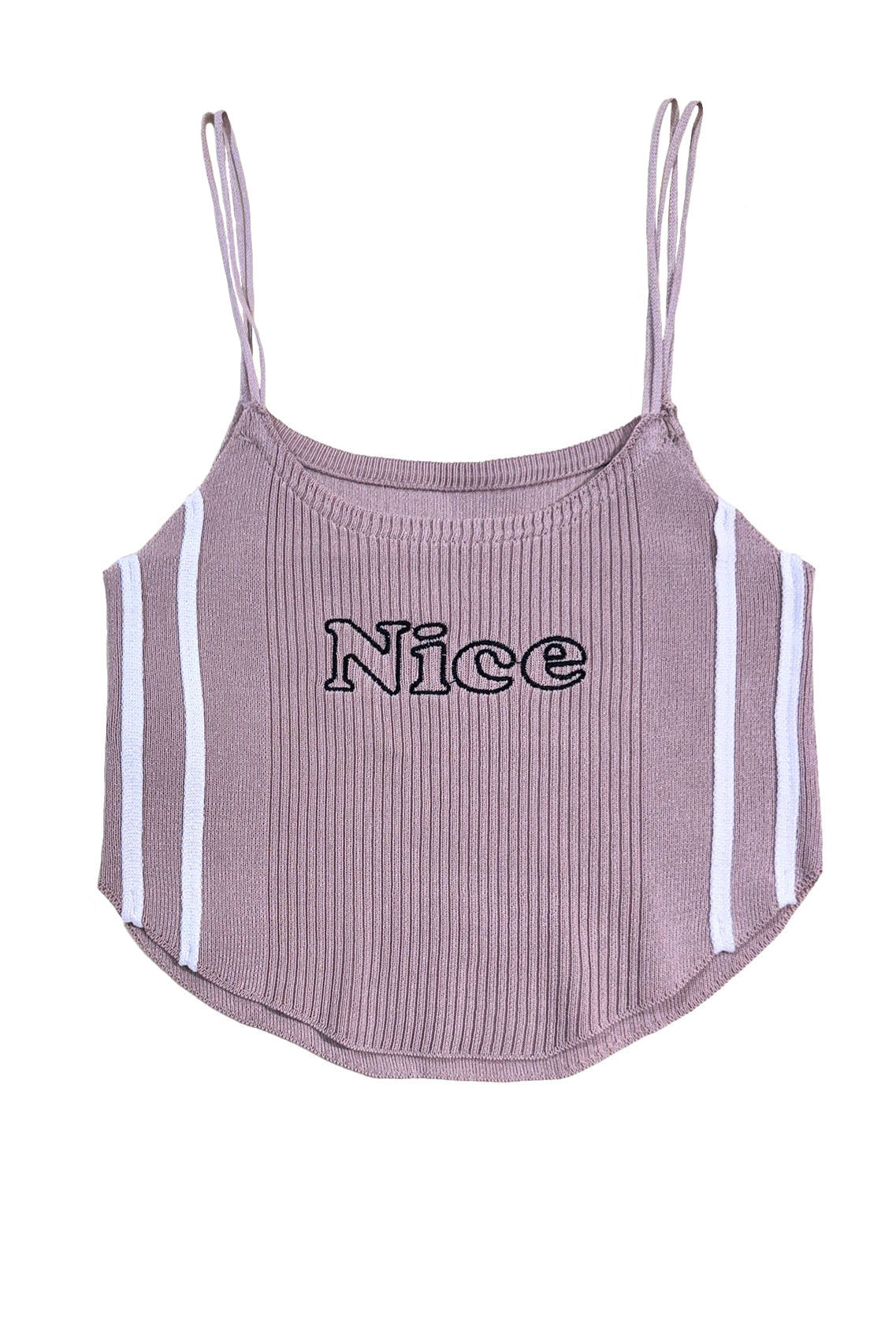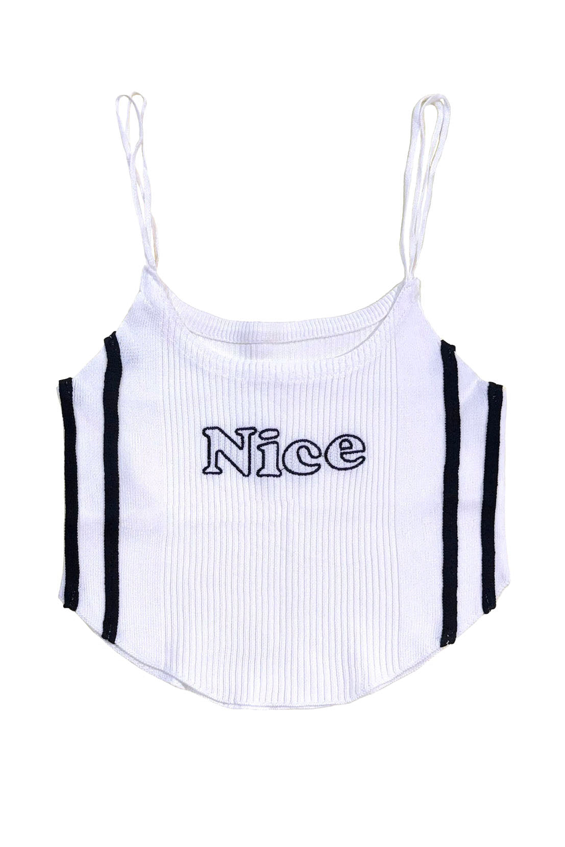 "Nice" embroidery crop top with double spaghetti straps. 2 stripes on both sides.